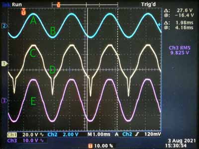 We hebben in het blauw het ingangssignaal van de versterker. In het geel het stuursignaal aan het rooster van één van de eindtrappen en in het magenta het uitgangssignaal van de versterker. µHet uitgangssignaal (E) is zowel positief als negatief beperkt (meer merkbaar aan de positieve kant). Men merkt ook een lichte vorm van overnamevervorming (crossover). Door de tegenkoppeling heeft men een overdreven stuursignaal. Dit is minder aanwezig bij de positieve uitsturing (C) dan de negatieve (D) omdat het rooster positief wordt en er een roosterstroom gaat lopen. maar in beide gevallen heeft de extra uitsturing geen effekt, de eindtrap werkt gewoon op zijn limiten. De afbeelding is afkomstig van een ontwerpschakeling waarvan de stuurtrap een veel te sterke versterking had.