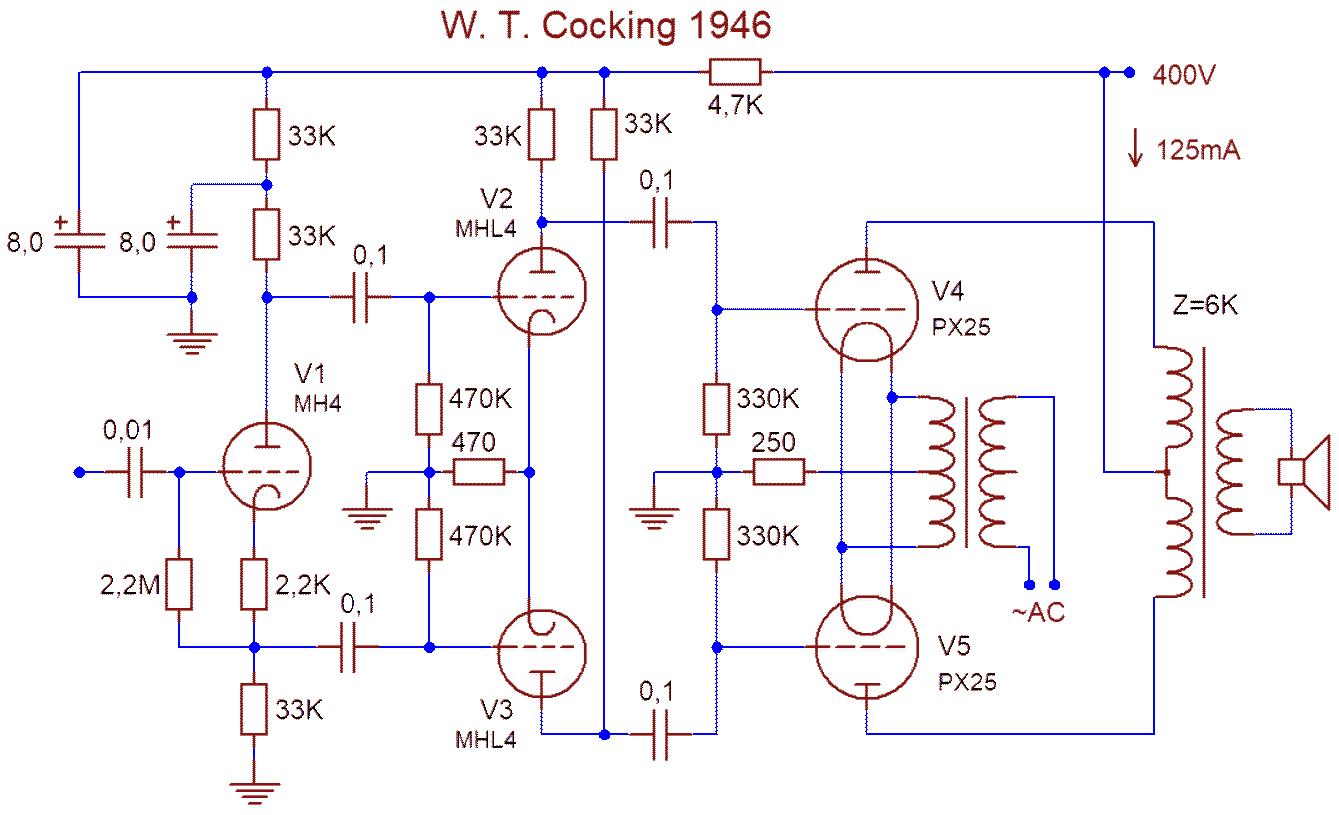 In het interbellum ontstaat er een standaardschakeling voor audioversterkers, de schakeling van Cocking. De schakeling is bedoelt voor bioscoopzalen en de geboden kwaliteit is ruim voldoende (de films hadden toen enkel een optisch spoor). De versterker bestaat uit een cathodyne fasedraaier, een long tail drivertrap en twee eindbuizen (toen nog triodes). De buizen van toen, de bekende 300A en 300B van general Electric voldeden ruimschots. Eindelijk een versterker die geen transformator gebruikt voor de fasedraaing! Het principe dat men toepast is een lage vervorming, die gaandeweg toeneemt als men meer vermogen nodig heeft. Een vervorming van 5% werd toen als zeer goed beschouwd, rekening houdend met het feit dat de geluidsbronnen uit die tijd een matig signaal gaven: 78 toerenplaten, AM radio en optisch geluid in de bioscoop). De luidsprekers waren ook niet te best, het waren soms nog hoornluidsprekers zoals bij oude platenspelers. De Cocking versterker voldeed prima. Het is pas na de tweede wereldoorlog dat men aan hifi begint te denken ("werkelijkheidsweergave" zullen de nederlanders zeggen). Williamson baseert zich op de schakeling van Cocking en voegt er een sterke tegenkoppeling aan toe. Om de verminderde versterking te compenseren moet er een voortrap bijkomen. De voortrap krijgt op z'n rooster het te versterken signaal en op zijn cathode een deel van het uitgangssignaal (tegenkoppeling). De buis werd eigenlijk als verschilversterker. Verder wordt de schakeling niet gewijzigd. De bedoeling is een vervorming te bekomen van minder dan 0.1%, een kenmerk van een hifi versterker. Met de tegenkoppeling haalt men de vooropgestelde .1% en de journalisten in die tijd zijn verrukt: "de beste versterker die er bastaat!" Maar de versterker heeft ook talrijke nadelen: