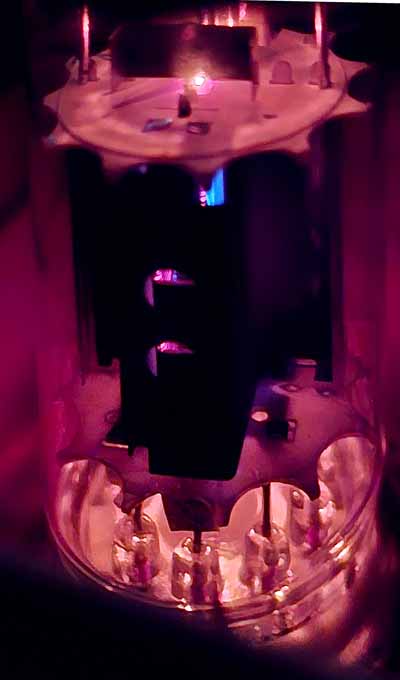 ![]() Ionisatie tussen de electrodes Door de buis vanaf boven te bekijken kan men soms beter de ionisatie tussen de electrodes zien.