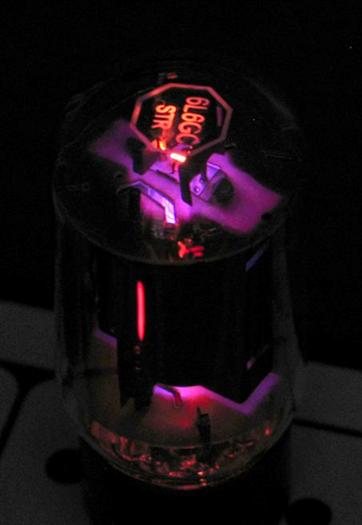 SpanningsstabilisatorenBij sommige buizen is ionisatie normaal: dit zijn de spanningsregelaars zoals de 85A2 en de OA2 die in de gestabiliseerde voedingen van Philips gebruikt werden. De gloed is oranje van kleur (zie afbeelding 1) en wordt veroorzaakt door het gas (neon) dat aanwezig is in de buis. De spanning over de electrodes blijft redelijk constant bij een stroom van bijvoorbeeld 1 tot 10mA. De kleine glimlampjes zijn eigenlijk gevuld met neon onder lage druk.