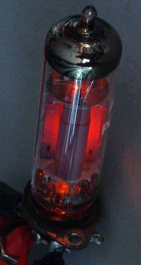 ![]() Deze fout moet direct opgelost worden: de versterker nooit verder gebruiken als de anode van één van de buizen roodgloeiend wordt. Een transistor zou direct defekt gaan bij een overbelasting, een buis kan een overbelasting kortstondig verdragen.