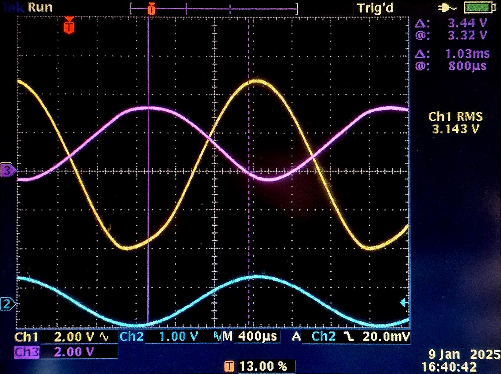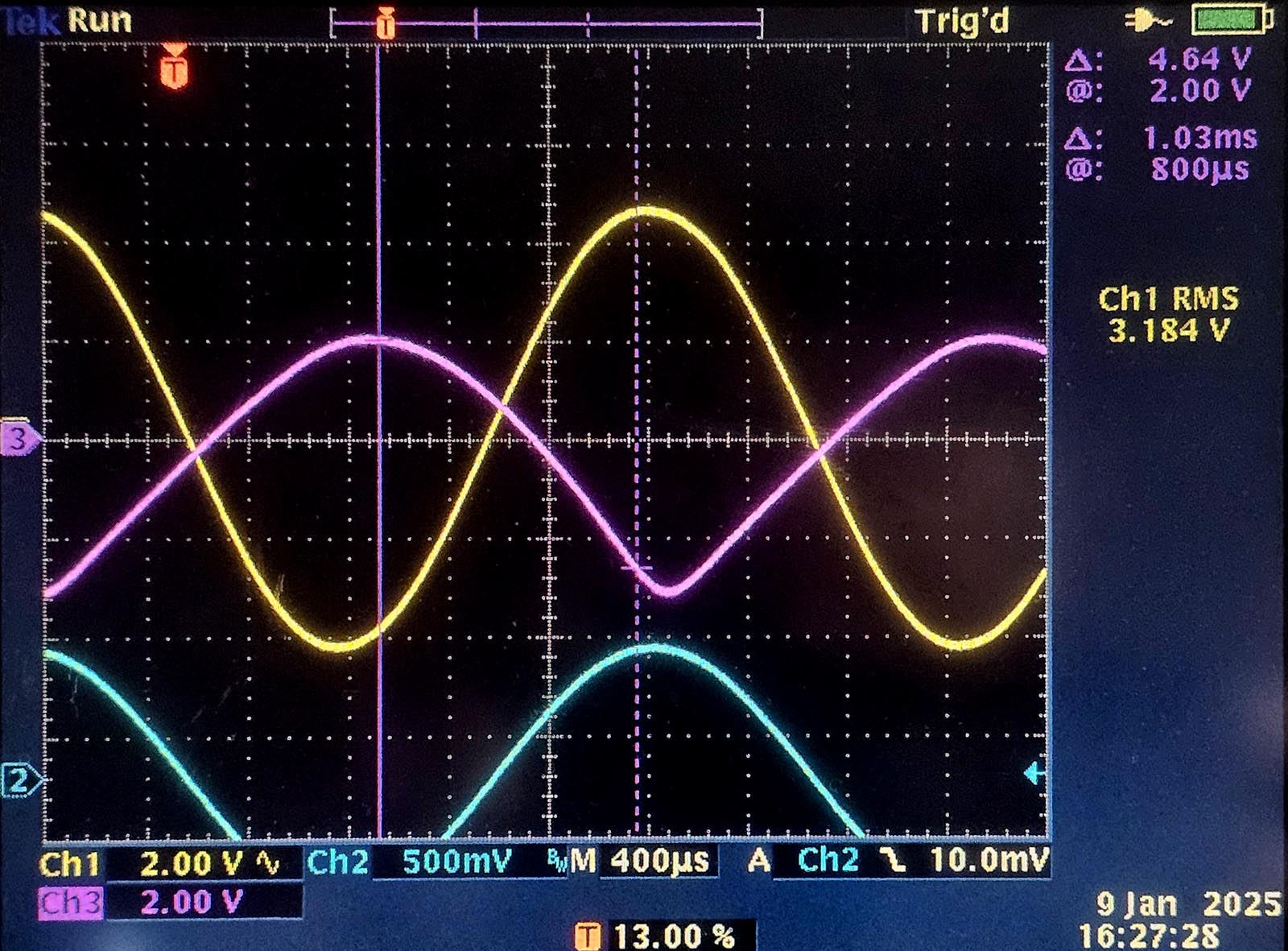 Op het tweede beeld hebben we een duidelijk voorbeeld van roostercontaminatie. We weten dat we te maken hebben met roostercontaminatie omdat het fenomeen na ongeveer één minuut optreedt. De roosterspanning gaat nu van 3.2V naar -0.4V. Het rooster wordt kortstondig positief ten opzichte van de cathode en op dat ogenblik is het uitgangssignaal vervormd.