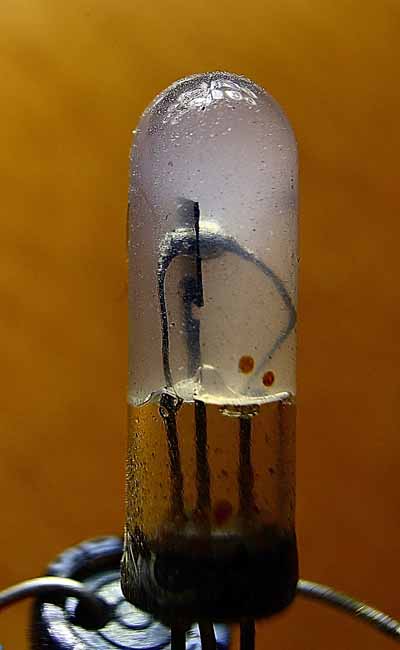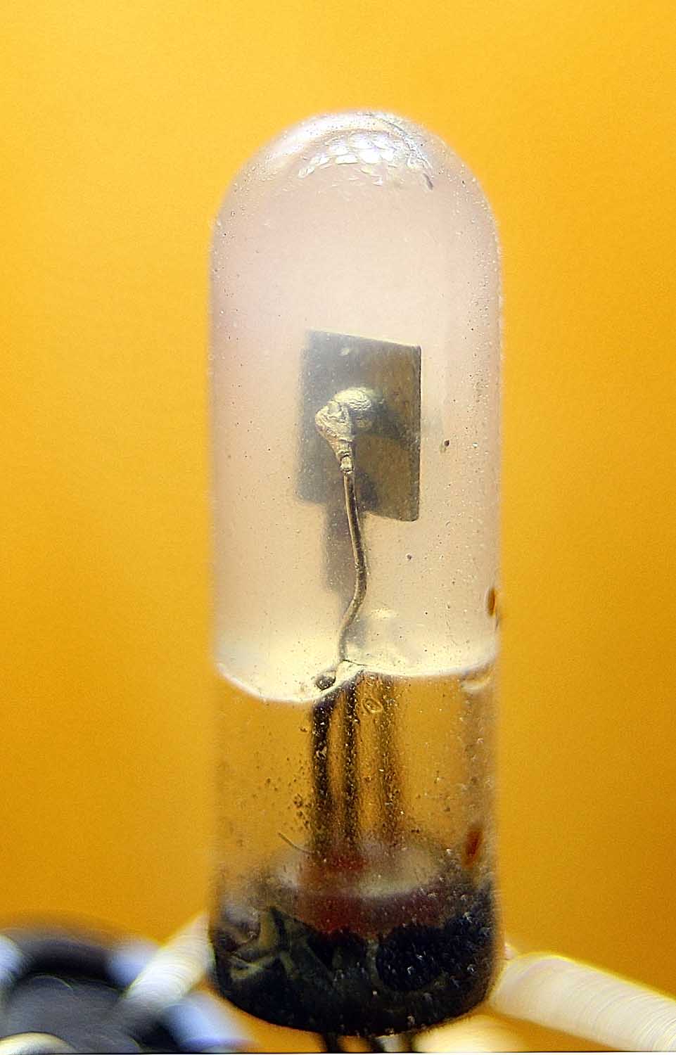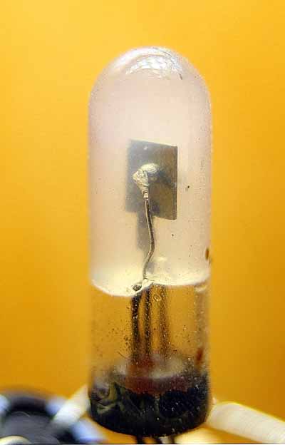 In Europa daartegenover...De amerikanen schakelen snel over op transistoren, maar in Europa blijft men de radiobuizen langer trouw. Zelfs de draagbare radio's waren nog uitgerust met buizen. Er worden ook hybride radios gebouwd, het hoogfrekwent gedeelte bestaande uit buizen en het laagfrekwent gedeelte uit transistoren. De geschiedenis van de radio staat hier uitgelegd. Ook televisies gebruiken transistoren, maar ook buizen voor het hoogfrekwent gedeelte en vooral voor het vermogen gedeelte. De eerste kleurentelevisies eind jaren 1960 waren nog uitgerust met buizen.De junctietransistor zal intensief gebruikt worden vanaf de jaren 1960 en 1970. In vergelijking met buizen zijn de eigenschappen maar matig: transistoren werken enkel op een lage spanning (dit kan zowel een voordeel als een nadeel zijn) en halen geen hoge frekwenties. De basis is te groot, waardoor er parasitaire capaciteiten zijn. De warmteafvoer is niet optimaal. Op de volgende foto's ziet men goed dat de warmteafvoer via het plastiek moet gebeuren. Een eerste stap om een hogere dissipatie te bekomen is een metalen behuizing gebruiken: indien nodig kan de transistor op een koelplaat gemonteerd worden. Foto 4 en 5 Transistor OC71 in een plastieken behuizing, oorspronkelijk bedekt met een verflaag. Deze transistor werd gebruikt in een flistdetector Macrofoto met Canon 5D MkIII, lens EF-S 18-55 /3.5-5.6 en tussenring EF 25 II De OC71 heeft de volgende eigenschappen: maximale vermogensdissipatie: 0.125W, maximale spanning: 20V, maximale collectorstroom: 10mA, versterking: 30×. Deze transistor werd gebruikt als laagvermogen audio versterker. Er bestond vroeger een OCP71 (zonder verflaag) die specifiek gebruikt werd voor zijn foto-electrische eigenschappen. De OC74 was geschikt om een luidspreker aan te sturen (het beschikbaar vermogen is echter lager dan bij een eindtrap met een buis). De transistor zit in een metalen koker die tegen een koelplaat gemonteerd kan worden.