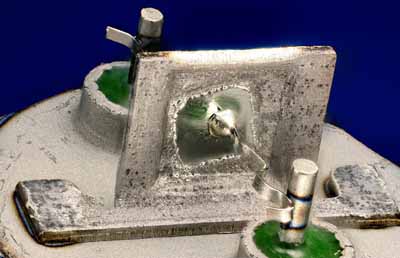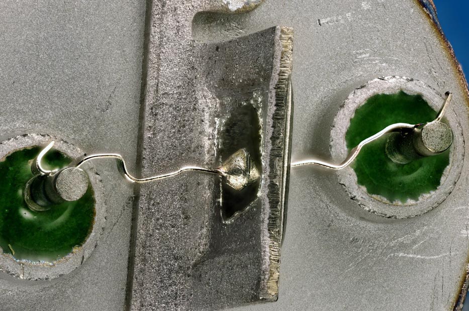 De junctie transistorFiguur 1De lagentransistor bestaat uit een dun plaatje N materiaal (germanium vijfwaardig gedopeerd), groen op de figuur. Aan beide zijden wordt een tablet driewaardig materiaal aangebracht, meestal is dat indium dat een goede geleider is en een laag smeltpunt heeft (155°c). Het plaatje wordt verwarmd tot boven het smeltpunt van indium. Het indium lost het germanium op, waardoor er P materiaal ontstaat, rood op de figuur. Er blijft ook nog een deel indium over waarop de aansluiting gesoldeerd wordt. De praktische realisatie is te zien op de foto's 2. Het is belangrijk dat er nog een dun laagje N germanium overblijft. Is die laag doorbroken, dan loopt de stroom gewoon door van emitter naar collector, is de laag te dik, dan heeft men geen transistorwerking, maar gewoon twee diodes. De stroomversterking van de transistor wordt grotendeels bepaald door de dikte van deze laag. Omdat de dikte vroeger nooit nauwkeurig vastgelegd kon worden tijdens de fabricage, was ook de versterking verschillend van transistor tot transistor. Na fabricage werden de transistoren uitgementen en kregen ze een extra letter om de versterking aan te geven: A, B of C (met A doorgaans een versterking van minder dan 100 en C een versterking van meer dan 250). Vanwege het lage smeltpunt van indium kunnen dergelijke transistoren slechts een beperkt vermogen dissiperen, voor consumertransistoren is dat ongeveer 100mW voor een transistor in een plastieken behuizing (foto's zie lager). Deze eerste junctietransistoren hadden een grote basis (zie figuur). De eerste transistoren (puntcontact en de eerste junctietransistoren) werden in die tijd noodgedwongen aangestuurd op de emitter en de basis werd geaard. De ingangsimpedantie van een transistorschakeling was daarom zeer laag, doorgaans een hondertal ohms terwijl de uitgangsimpedantie hoog was. De stroomversterking was lager dan 1 (gemeenschappelijke basisschakeling). Deze schakeling kon ook de slechte eigenschappen van deze transistoren wat verdoezelen, namelijk de maximale werkfrekwentie, die in de buurt van 1MHz lag. Dergelijke transistoren konden niet gebruikt worden in het radiofrekwent gedeelte van een radio, en zo komt het dat de eerste transistorradios hybride waren: buizen voor het radiofrekwent gedeelte en transistoren voor het laagfrekwent gedeelte. Foto 3 Uitsnede van een transistor IBM 083. Deze transistor werd gebruikt als signaalversterker, bijvoorbeeld om het sense-signaal van kerngeheugen te versterken.