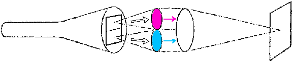 Het eerste systeem was zeer vernuftigd (telechrome) en gebruikte een buis met twee electronenkanonnen die een dubbele doorzichtige fosforplaat bereikte. Iedere kant had een fosforlaag die ofwel orange-rood ofwel groen-blauw oplichtte. Dit was voldoende voor de meeste studiotoepassingen, maar gele en groene tinten konden niet weergegeven worden. Op het beeld rechts zie je John Logie Baird met de telechrome met twee kleuren, de enige beeldbuis die effektief ontwikkeld werd. De tweede afbeelding is een foto van zo'n scherm in werking, een bewijs dat kleur toen al mogelijk was.