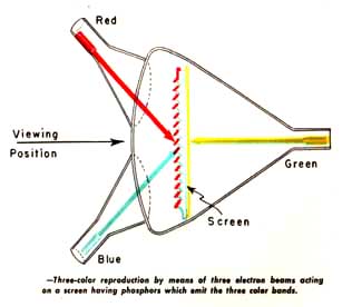 Rechts twee versies van de telechrome met drie kleuren, geen enkele versie werd effektief gebruikt in testen. In die tijd waren er geen televisieuitzendingen meer ten gevolge van de oorlog en na de oorlog dacht men niet aan televiseuitzendingen. Men moest eerst het land opnieuw opbouwen. Het waren de beginjaren van de televisie (die toen enkel monochroom was) en er werden experimenten gedaan in verschillende landen. Men hield geen rekening met een eventuele compatibiliteit met zwart-wit televisietoestellen want er waren nauwelijks televisies. Maar toen de kleurentelevisie later effektief gelanceerd werd, werden enkel compatibele systemen in overweging genomen, want de meeste gezinnen hadden toen al een (zwart-wit) televisie. In de Verenigde Staten heeft men experimenten uitgevoerd met televisies met drie beeldbuizen (Triniscope), maar de toestellen waren te lomp en het kijkhoek was te beperkt. De beeldkwaliteit was nochtans zeer goed en vaak vergeleken met een Kodachrome dia. Men is snel tot de conclusie gekomen dat een dergelijk systeem economisch niet haalbaar zou zijn. In die tijd had men nog geen fosforsamenstelling gevonden die rode tinten kon weergeven. Voor de rode kleur gebruikte men een beeldbuis met een witte fosfor en men plaatste een rode filter voor het scherm. Later, als men kathodestraalbuizen met drie kanonnen en een schaduwmasker zal gebruiken, had men lange tijd problemen om de rode tinten accuraat weer te geven. Om toch voldoende heldere rode tinten te hebben gebruikte men een fosforsamenstelling die een orangeachtig beeld gaf. De Chromatron gebruikte één electronencanon en geen schaduwmasker, maar een dubbele rooster die enkele centimeter voor het scherm geplaatst was. Door de spanning op de roosters te wijzigen kon men de electronenstraal afbuigen zodat ze de juiste fosfor (rood of blauw) bereikte. Als ergeen spanningsverschil op de roosters was, dan bereikte de straal de groene fosfors. Dit systeem werd ontwikkeld en toestellen werden verkocht, maar bleek nog minder betrouwbaar dan het schaduwmasker systeem (dat al niet echt betrouwbaar was). Sony heeft de chromatron gebruikt in zijn eerste kleurentv's, maar stapte snel op een eigen systeem, de Trinitron. Een systeem dat beperkt ingezet werd is het kleursekwentieel systeem van CBS dat gedeeltelijk mechanisch was. Men is echter snel overgegaan op de kleurenbeeldbuis met schaduwmasker van RCA. Zelfs Philips, die toen ook aan het experimenteren was met kleurentelevisie heeft dergelijke beeldbuizen gebruikt. Het schaduwmasker slorpte 2/3 van de electronen op en het beeld was daardoor zeer somber, maar het was het enige systeem dat mogelijk was. John Baird is in 1946 gestorven en heeft geen uitzendingen in kleur meegemaakt. |