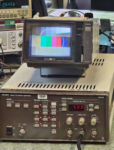 Het televisiesignaal is gebaseerd op het Lab kleurmodel met één helderheidskanaal en twee kleurverschilkanalen. Rechts zien we een testbeeldgenerator en een Sony monitor. Het composiet videosignaal werd vroeger KBOS genoemd: kleur-beeld-onderdrukking-synchronisatie.