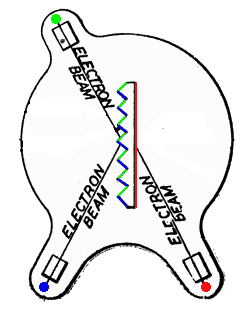Het ontwerp rechts met drie elektronenkanonnen en een target bestaande uit een soort roosterstruktuur voor groen en blauw werd nooit in de praktijk toegepast. Bij een andere versie worden de kleurkanonnen aan één kant geplaatst (wat toch gemakkelijker is), maar die is ook nooit in produktie genomen. Het was technisch onmogelijk om de drie stralen te laten samenvallen op het scherm (de stralen moeten een trapeze tekenen).