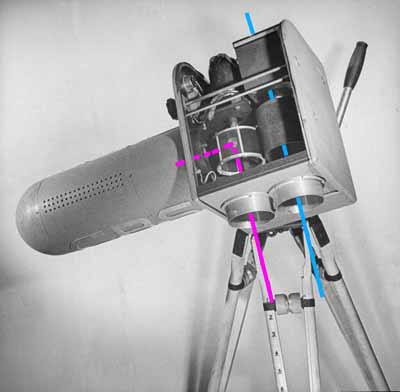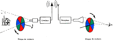 Prototype van een kleurencamera volgens het field sequential systeemDe camera gebruikt twee optieken, één voor de operator (cyan straal) die het beeld ziet dat opgenomen zal worden en een (aangegeven door de magenta straal) gaat naar de opnamebuis.De straal voor de opnamebuis wordt door een spiegel afgebogen, de spîegel staat in het midden van een kleurencylinder. Het licht gaat verder naar de opnamebuis (grote metalen cylinder links in beeld) maar moet eerst door de draaiende kleurenfilter passeren. De motor om de kleurencylinder aan te drijven staat boven in beeld. Men ziet de CBS indicatie: dat is de firma die het systeem probeerde te lanceren. Het voordeel van dit systeen was zijn eenvoud: de norm kon direct toegepast worden zonder grote wijzigingen aan de camera's en televisies. Het systeem is bijzonder eenvoudig in vergelijking met het systeem dat later gebruikt zal worden (NTSC). Het NTSC systeem gebruikte 3 monochrome opnamebuizen die precies ingesteld moesten worden. De camera's konden enkel in de studio gebruikt worden, en voor reportages op een buitenlokatie was men aangewezen op 16mm film als men een kleurenopname wenste.