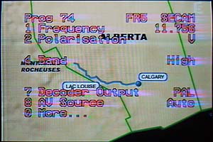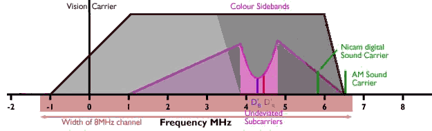 ![]() De grafiek toont de bandbreedte van de kleurinformatie. Als er geen kleurinformatie aanwezig is, dan wordt enkel de draaggolf verstuurd. Hoe sterker de kleur aanwezig is, hoe sterker de deviatie ten opzichte van de grondfrekwentie. De frekwentiezwaai gaat van 3.9 tot 4.75MHz, maar door de modulatie ontstaan er mengprodukten die aanwezig moeten blijven om de kleur te kunnen decoderen. Dit is het volkaan in paars op de afbeelding. Om de zichtbaarheid van het FM signaal te verminderen, gaat men zijn amplitude verminderen als de modulatiediepte laag is (weinig kleur in beeld), bij AM zouden we deze modulatievorm "met verminderde draaggolf" noemen. In de ontvanger gebruikt men een omgekeerde filter (met een klok-vorm) om de amplitude opnieuw te normaliseren; dit is nodig omdat de demodulator toch gevoelig is voor amplitudeverschillen. Toch blijven er storingen aanwezig, bijvoorbeeld als het beeld verticale lijnen bevat. Dit was zo storend, dat de fransen de bandbreedte van de helderheid noodgedwongen hebben beperkt tot 3.6MHz, zogezegd om nicam stereo mogelijk te maken. De beeldkwaliteit was toen niet veel beter dan die van een videorecorder. Hoe beter de televisies werden, hoe slechter het SECAM beeld werd.
