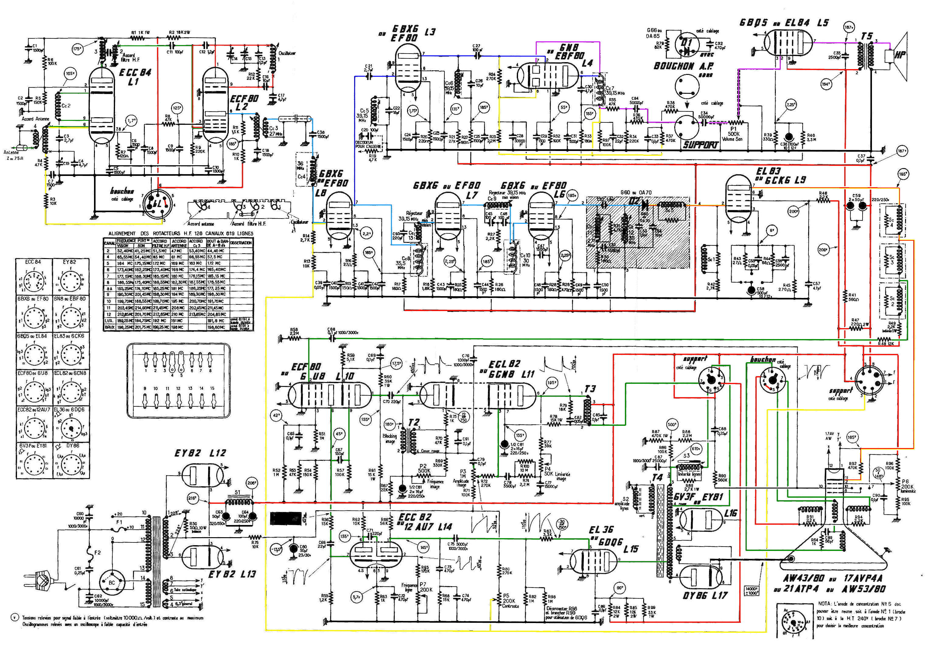 Teleavia P111 Verschillende reklamefolders tonen een op de grond zittende persoon, waarbij het scherm naar beneden gedraaid is. Dit was absoluut "not done" in die tijd. Volgens de reklame had het toestel ook geen stroomaansluiting of antenne nodig. Het toestel werd eind jaren 1950 gelanceerd, maar het franse publiek was veel te traditioneel ingesteld en het toestel trok de aandacht, maar dan vooral in het buitenland, waar het toestel onmogelijk gebruikt kon worden (maar daarover meer later). Het merk Teleavia bestaat nog steeds en maakt nog altijd televisietoestellen (met een vlak scherm, natuurlijk), maar met gebogen hoeken. Het shcerm heeft geen boord, het beeld is zichtbaar op de volledige voorplaat (zoals een moderne smartphone). Het toestel heeft een voedingstransfo: dit is nodig want er waren toen nog verschillende electriciteitsnetten: 110V, 130V en 220V. Later zal men een spanningsverdubbelaar gebruiken om van 110V 250V te maken, maar zo'n schakeling werkt niet efficient met buizen, vanwege de spanningsval over twee buizen. Zolang men niet kan beschikken over efficiente siliciumdiodes zal men een transfo moeten gebruiken. DE voedingstransfo levert zowel de gloeispanning als de hoogspanning. Voor de hoogspanning worden er twee EY82 diodes gebruikt. Het is een dubbelfasige gelijkrichter, waardoor de rimpel minder aanwezig is. Na de gelijkrichting komt zelfs een smoorspoel! De hoogfrekwente trap is klassiek voor de tijd, met een cascodeschakeling met dubbele triode ECC84 als hoogfrekwente versterkertrap (de dubbele triode zal vervangen worden door een PCC88 in toestellen zonder voedingstransfo). De mengtraps is gebouwd rond een ECF80, een buis die speciaal voor dergelijke toepassingen gebouwd werd (de buis zal vervangen worden door een PCF80). De triode is de oscillator, de pentode de mengtrap. Het toestel kon enkel VHF-I en VHF-III ontvangen, de enige banden die toen in gebruik waren. De tuner is een losse unit die gemakkelijk vervangen kan worden. Voor het middenfrekwent gedeelte gebruikt men drie EF80 terwijl men toen al kon beschikken over de EF184 die beter geschikt was voor de hoge frekwenties en hoge bandbreedte die nodig zijn bij televisies. De EF184 zijn zelfs pin-compatibel, waarbij enkel de afstemming een beetje moet aangepast worden. Het signaal wordt tenslotte gedetecteerd en vormt het videosignaal (met positieve modulatie, dit is te zien aan de diode die "omgekeerd" geplaatst is naar onze normen). De videobuis is een EL83 een buis die speciaal voor die taak ontworpen werd. Vanwege de hoge lijnfrekwentie is de videobandbreedte ook dubbel zo groot en moet men een zwaardere buis gebruiken. Er is een fouje in de schakeling: de weeerstand R92 van 470kΩ maakt normaal een verbinding met de gloeidraad, niet met de cathode van de beeldbuis. De weerstand zorgt ervoor dat de gloeidraad op ongeveer hetzelfde potentiaal zit als de cathode, want de beeldbuis heeft zijn eigen wikkeling op de voedingstransfo. Wat betreft het audio-gedeelte hebben we een gemeenschappelijke middenfrekwent pentode (audio en video) gevolgd door twee pentodes EF80 en EBF80. Het signaal is AM gemoduleerd in Frankrijk. De eindtrap is een EL84. De intercarrier kan niet gebruikt worden in Frankrijk (zou twee buizen uitgespaard hebben). De synchronisatiepulsen worden aan de videotrap afgenomen, versterkt door een ECF80 (pentode-gedeelte). Een hoogdoorlaatfilter laat enkel de lijnpulsen door naar een dubbele triode ECC82 die volledig in saturatie gestuurd wordt. De eindtrap is een EL36 die men in veel toestellen uit die tijd zal aantreffen (onder de vorm van een PL36). Voor het raster is de werkwijze wat complexer: men gebruikt een blokkeeroscillator die door de rasterpuls getriggerd wordt. De eindtrap is een ECL82. Wat is er nog speciaal aan deze schakeling? Het toestel werd gemaakt voor de franse markt (819 lijnen, positieve beeldmodulatie en AM geluid). Dit systeem werd gelanceerd om de franse markt te beschermen, maar protectionisme is een zwaard dat aan beide kanten snijd en dit toestel kon niet geëxporteerd worden, want niemand anders gebruikte die norm. Er is geen automatische gain regeling (zeer moeilijk te voorzien in toestellen die met positieve beeldmodulatie werken). De contrastregeling werkt op de eerste hoogfrekwente trap (cascodetrap) en op de eerst middenfrekwente trap. Dit systeem heeft als gevolg dat de synchronisatie kan wegvallen als men het contrast verlaagt omdat de syncpulsen dan te zwak worden. Er is wel een automatische volumeregeling op de eerste middenfrekwente audiotrap, dit is noodzakelijk voor AM geluid. Om de stoorpulsen op AM te onderdrukken heeft men een extra schakeling voorzien die achteraf ingebouwd werd. De schakeling die hier gebruikt wordt is eenvoudig, zie voor de uitleg over een dergelijke schakeling de pagina over AM geluid bij televisie. Als men een binnenshuis antenne gebruikt, dan worden ook de lokale stoorbronnen opgenomen, waaronder de lijnpulsen van de beeldeindtrap. Hoewel het toestel met een VHF tuner uitgerust werd, kon het toestel maar één zender ontvangen, namelijk de eerste franse zender. Als het tweede en derde net gelanceerd zullen worden, dan zal het in 625 lijnen zijn (maar nog steeds met een positieve modulatie en AM geluid, beide minderwaardig). Al een paar jaren na de lancering van het toestel is er sprake van de 819 lijnen op te doeken, wat het toestel volledig onbruikbaar zou maken. Het toestel ombouwen tot een multinorm toestel zou teveel gekost hebben, maar in de jaren 1960 tot 1970 moesten alle franse toestellen noodgedwongen multinorm zijn (819 + 625 lijnen). Uiteindelijk werd het eerste net ook uitgezonden in 625 lijnen. |