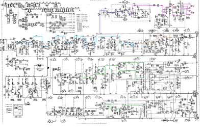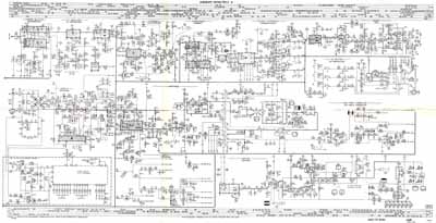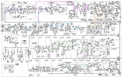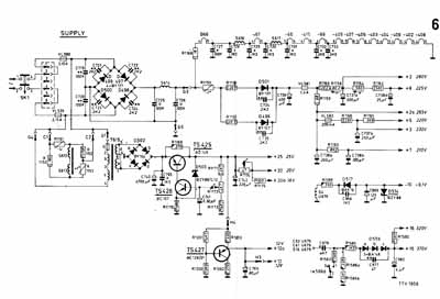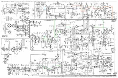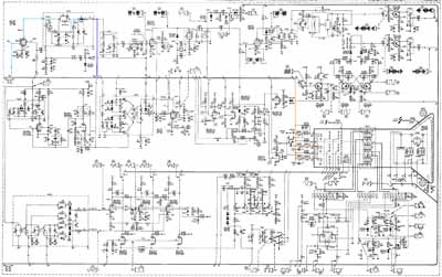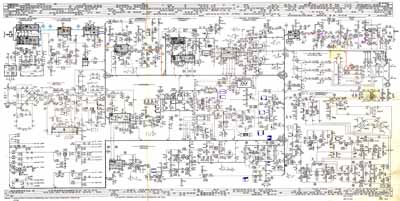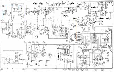 Chassis K9 en K11Beide chassis lijken sterk op elkaar. Door het gebruik van een verbeterde beeldbuis kon de convergentie vereenvoudigd worden in de K11. Het schema kan weer op één bladzijde: het inwendige van de modules wordt niet meer getoond, het is de bedoeling dat bij defekt de volledige module vervangen wordt.Er is maar één buis over, de beeldbuis. Voor de lijneindtrap gebruikt men twee parallel geschakelde BU108 (die later vervangen zal worden door een enkele BU208). Bij bepaalde productieruns gebruikt men een 2SD350A. De rastereindtrap bestaat uit een klassieke push-pull eindtrap, maar voor het audio-gedeelte gebruikt men een vreemde constructie, afgeleid van de "Bi-Amp" Philips audioversterkers met buizen. Deze versterkers hebben een hoge uitgangsweerstand, waardoor een transfo nodig is. De lijneindtrap levert eveneens de secundaire spanningen: de oscillator kan zelfstandig opstarten op de 155V (gestabiliseerde netspanning), en dan komen de hulpspanningen eveneens op. Deze werkwijze zal in de verschillende uitvoeringen verder gebruikt worden. |