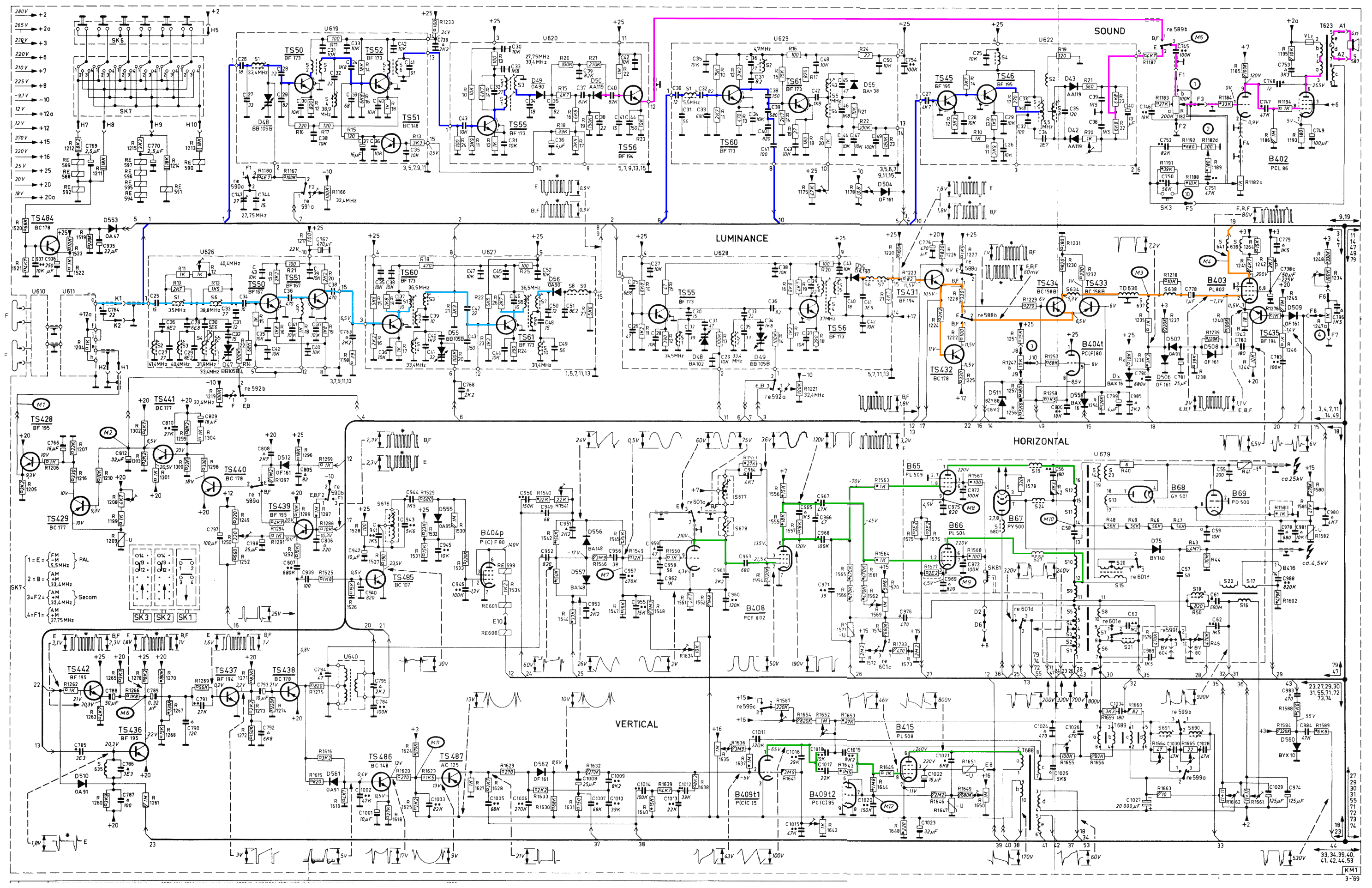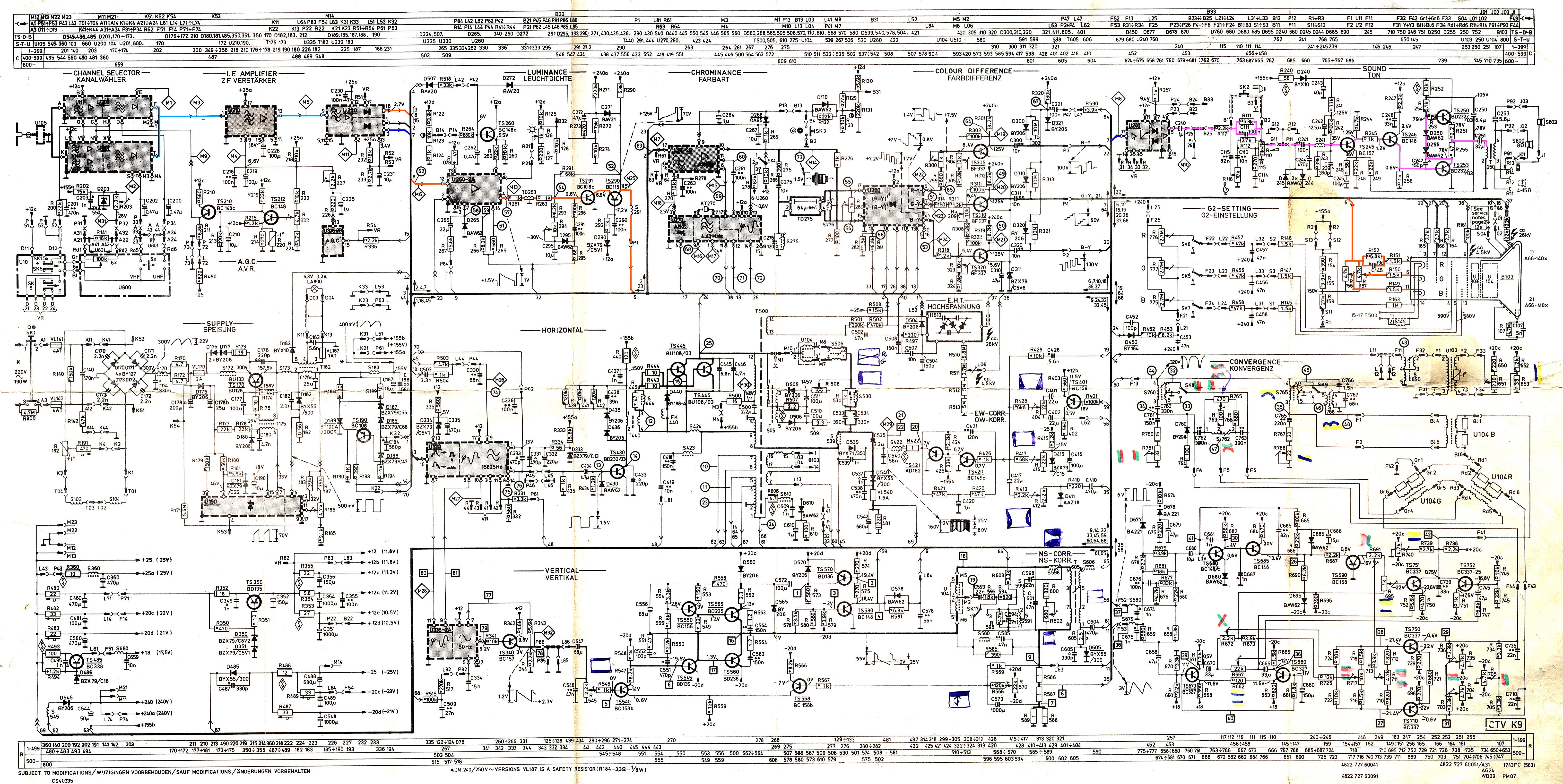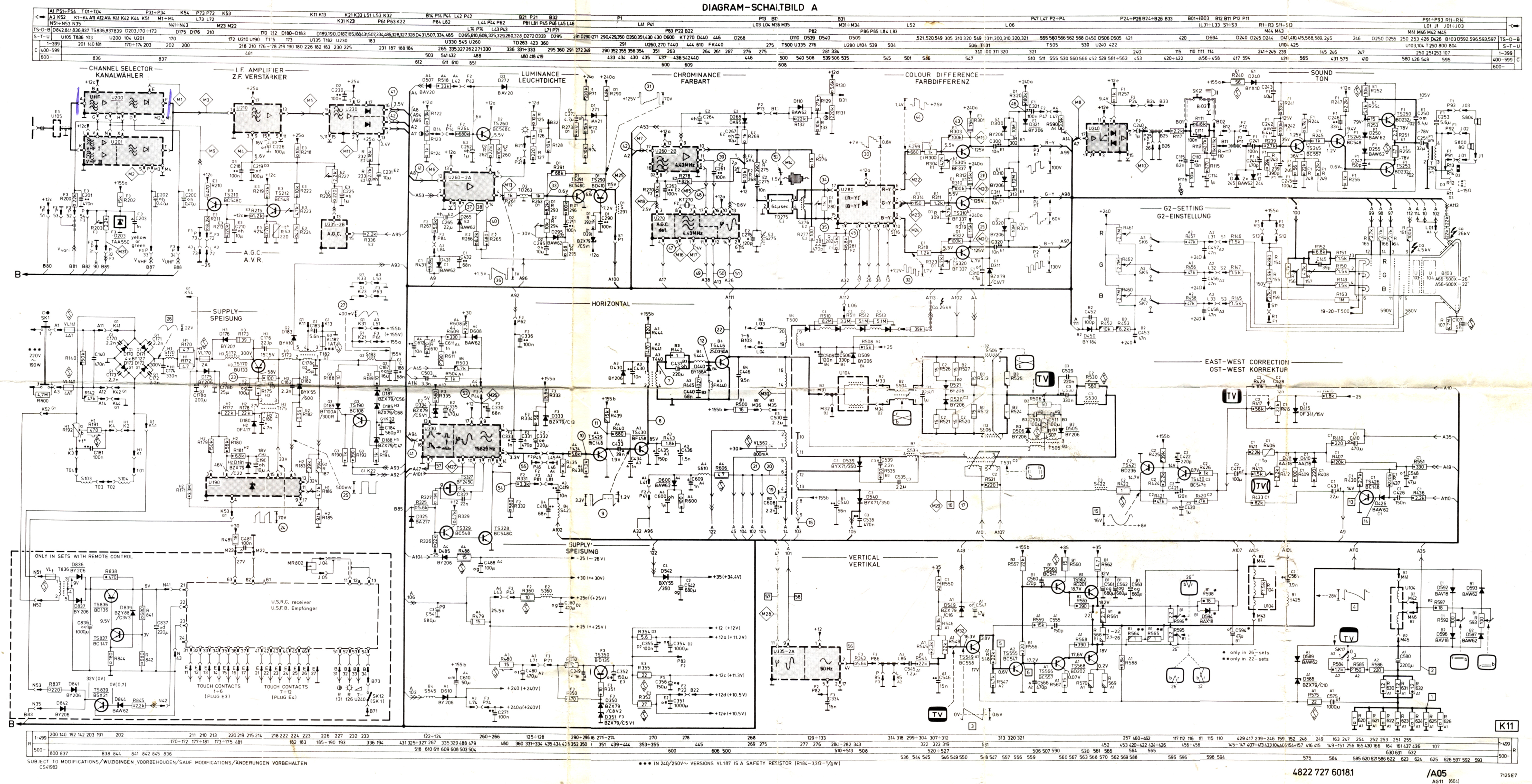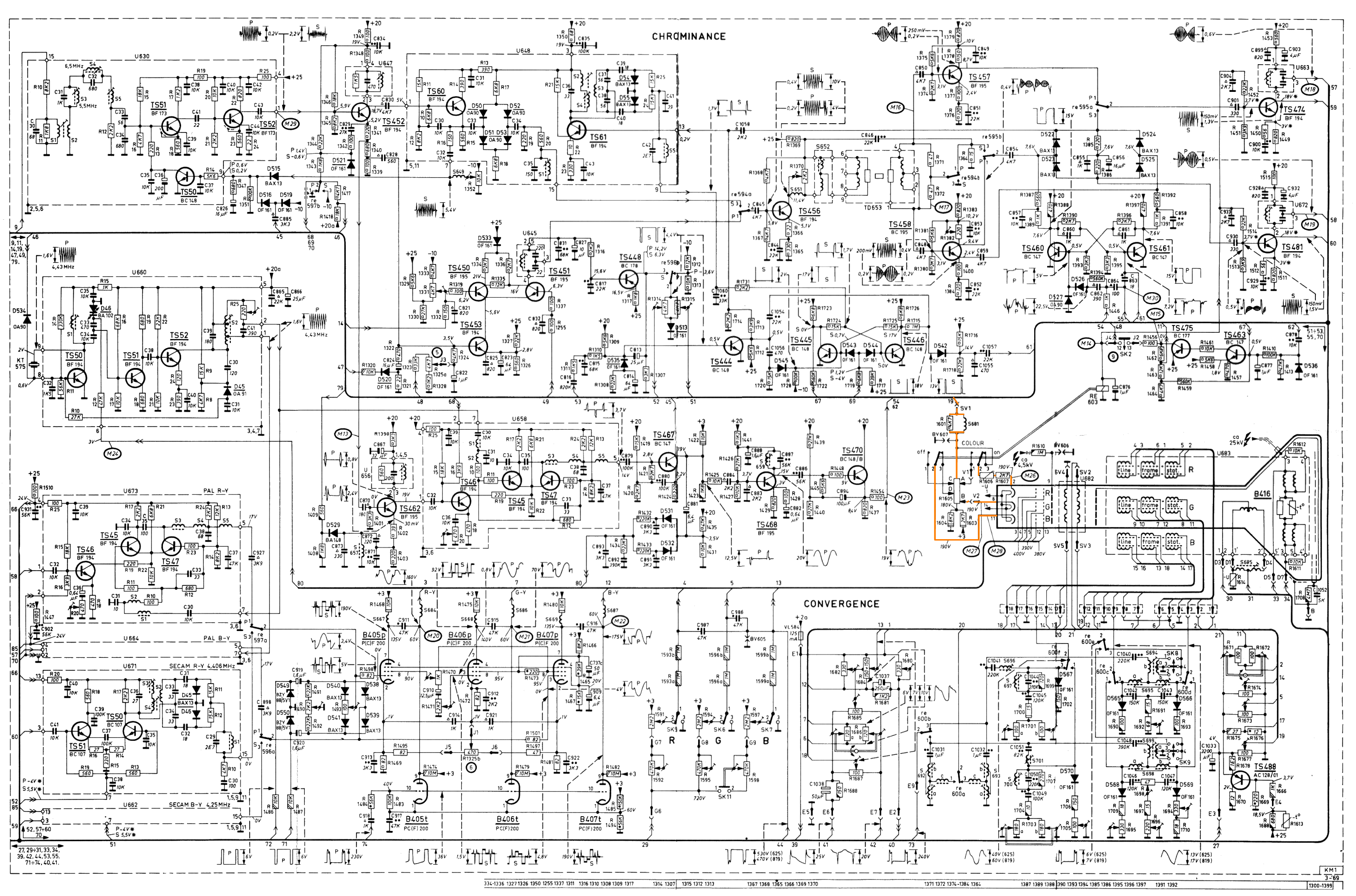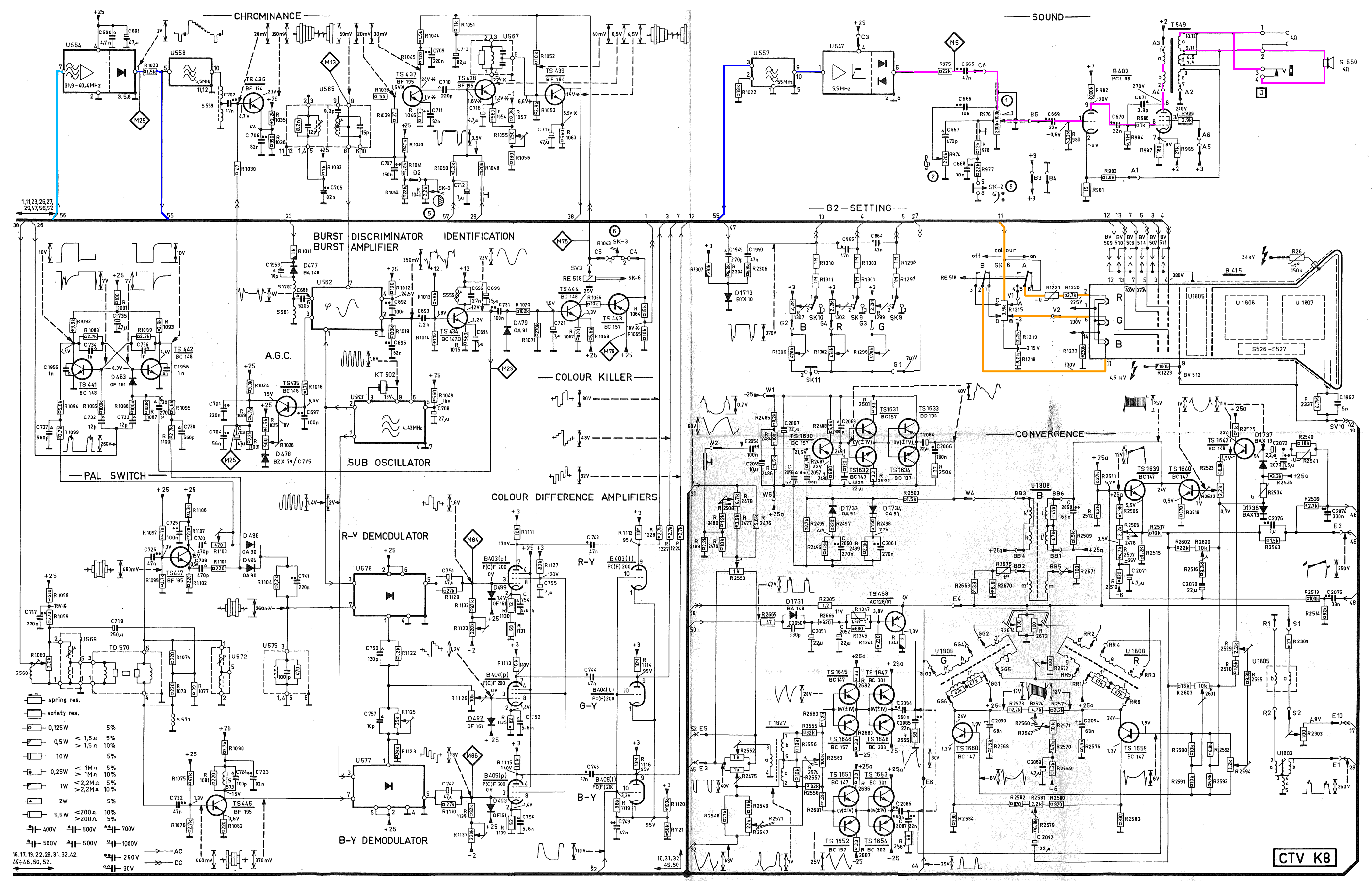 Chassis K6Dit eerste chassis gebruikt een hybride technologie (buizen en transistoren), maar met voornamelijk buizen. Omdat het toestel een afbuighoek van 90° heeft moeten de afbuigstromen sterker zijn, maar ook de correcties moeten sterker ingrijpen. Toch volstaan passieve componenten voor de instellingen (regelbare weerstanden).Het beeld is duidelijk minder fel dan die van een zwart-wit televisie (die toen goed op punt was) en de mensen werden aangeraden televisie te kijken in een verduisterde ruimte. Het schaduwmasker slorpte ongeveer 70% van de electronen op. Er worden enkel transistoren gebruikt in het middenfrekwent gedeelte voor het geluid, in de eerste videotrap en in enkele kleurschakelingen. Voor het belgenland fabriceert men een chassis dat aangepast is aan de belgische norm (AM geluid en positieve beeldmodulatie). Deze belgische norm heeft nooit een CCIR-erkenning gekregen. De belgische norm werd geselecteerd door de knop op de positie "B" te zetten, terwijl de echte B-norm (CCIR B en G) geselecteerd werd op de positie "E". En de echte CCIR-E norm is in feite de franse 819 norm, die geselecteerd werd op de positie "F1". Volgt u nog? Gelukkig was het toestel enkel voorzien voor de PAL kleurennorm. In Engeland bestond deze uitvoering onder het chassis G6 die aangepast werd voor de engelse markt met de 405 lijnen (CCIR-A norm, enkel zwart-wit) en de 625 lijnen in kleur. De engelse 625 lijnen verschilde van de continentale 625 lijnen met een andere frekwentie van de geluidsdraaggolf (6MHz in plaats van 5.5MHz). Deze toestellen werden in Engeland gefabriceerd uitsluitend voor de lokale markt. Wat valt er speciaal aan te merken aan dit chassis? Er worden 4 middenfrekwent trappen gebruikt en er zijn twee gescheiden beelddetectie trappen gebruikt, één voor de helderheid, en één voor de kleurhulpdraaggolf en de geluidshulpdraaggolf. Het belgisch toestel heeft een extra AM trap voor het geluid en een omkeertrap voor het videosignaal. De AM trap is hier ook uitgerust met een noise gate die via de link besproken wordt. Dezelfde noise gate zal ook bij het K7 chassis gebruikt worden. De lijnuitgangstrap gebruikt twee vermogenpentodes die min-of-meer parallel werken (dit lukt niet zo goed als men twee verschillende pentodes gebruikt en men moest de balans heel nauwkeurig instellen om te vermijden dat één van de pentodes rood oplichtte). De vermogenspentodes (lijn) zijn een PL500 en een PL505 en een PL508 voor het raster. Er wordt een kleurverschilsignaal naar de beelduis gestuurd: de helderheid (zwart-wit) wordt naar alle cathodes gestuurd, terwijl het kleurverschilsignaal naar de roosters gestuurd wordt. Het was toen moeilijk om perfect lineaire schakelingen te bouwen en een fout zou snel opvallen door kleurfranjes in beeld. Door te werken met een helderheidssignaal met normale bandbreedte en drie kleurverschilsignalen met beperkte bandbreedte vallen de eventuele verschillen niet op. Deze manier van doen zal in de volgende chassis verder gebruikt worden, al betekent dit dat er een extra buis nodig is. Het helderheidssignaal passert door een kamfilter (TD560) om de kleurinformatie uit het helderheidssignaal te filteren. Deze filter zorgt eveneens voor een heel lichte vertraging van het helderheidssignaal ten opzichte van het kleursignaal. Dit is nodig omdat het kleursignaal met zijn beperktere bandbreedte een langere looptijd heeft.