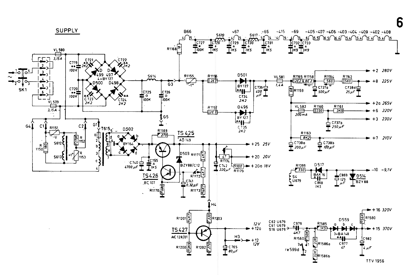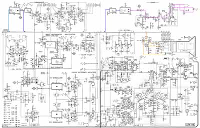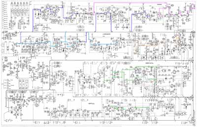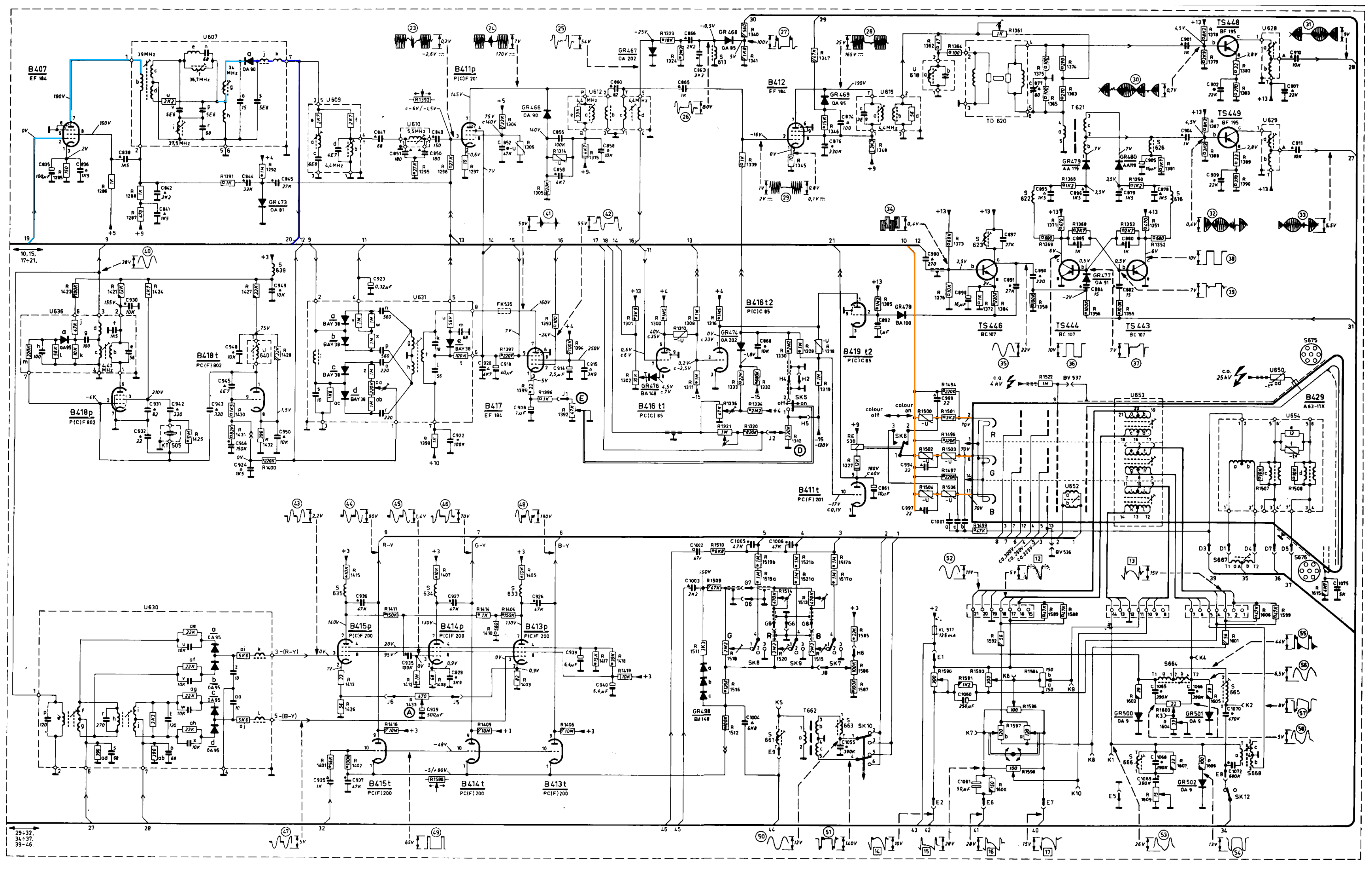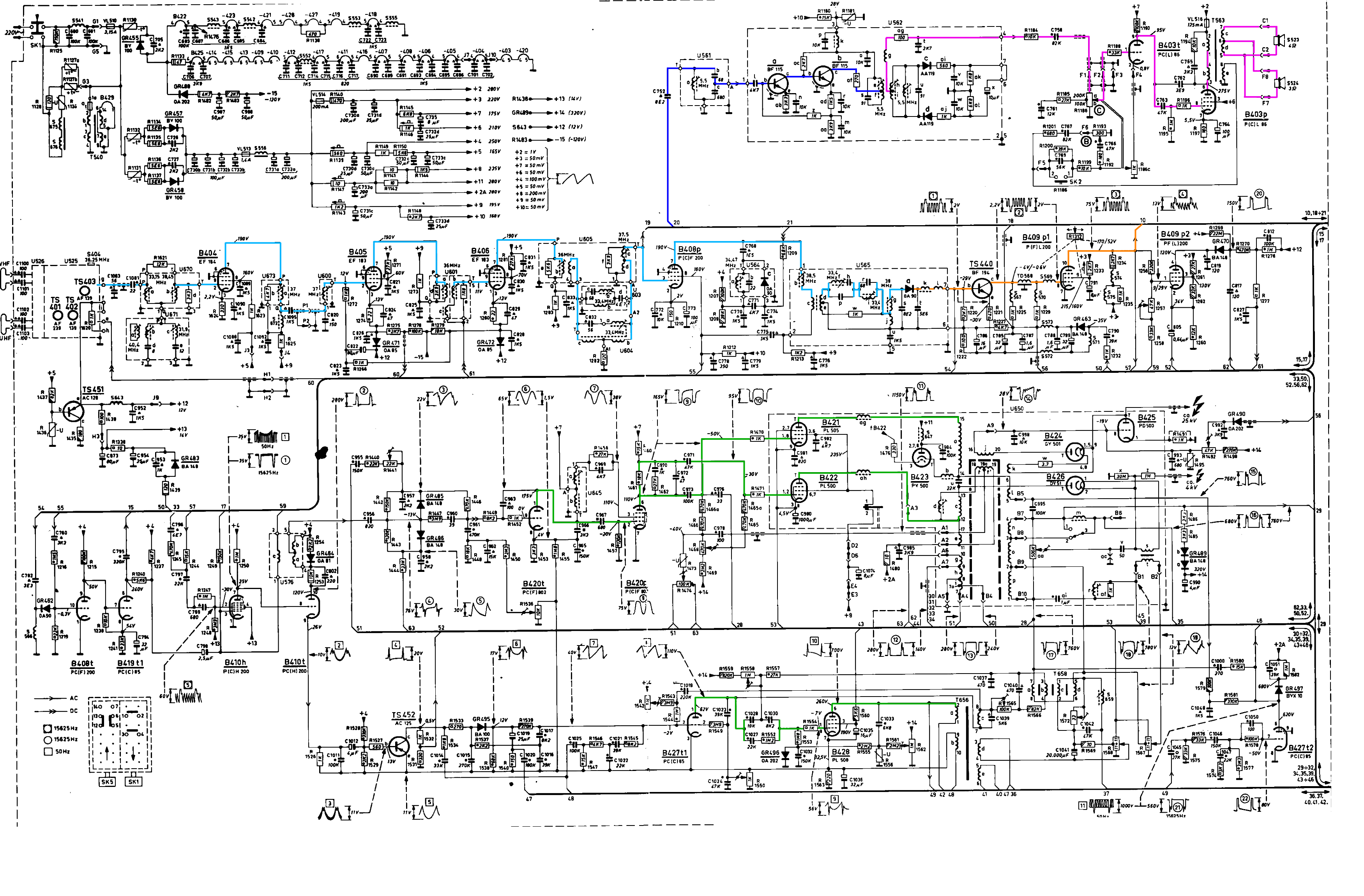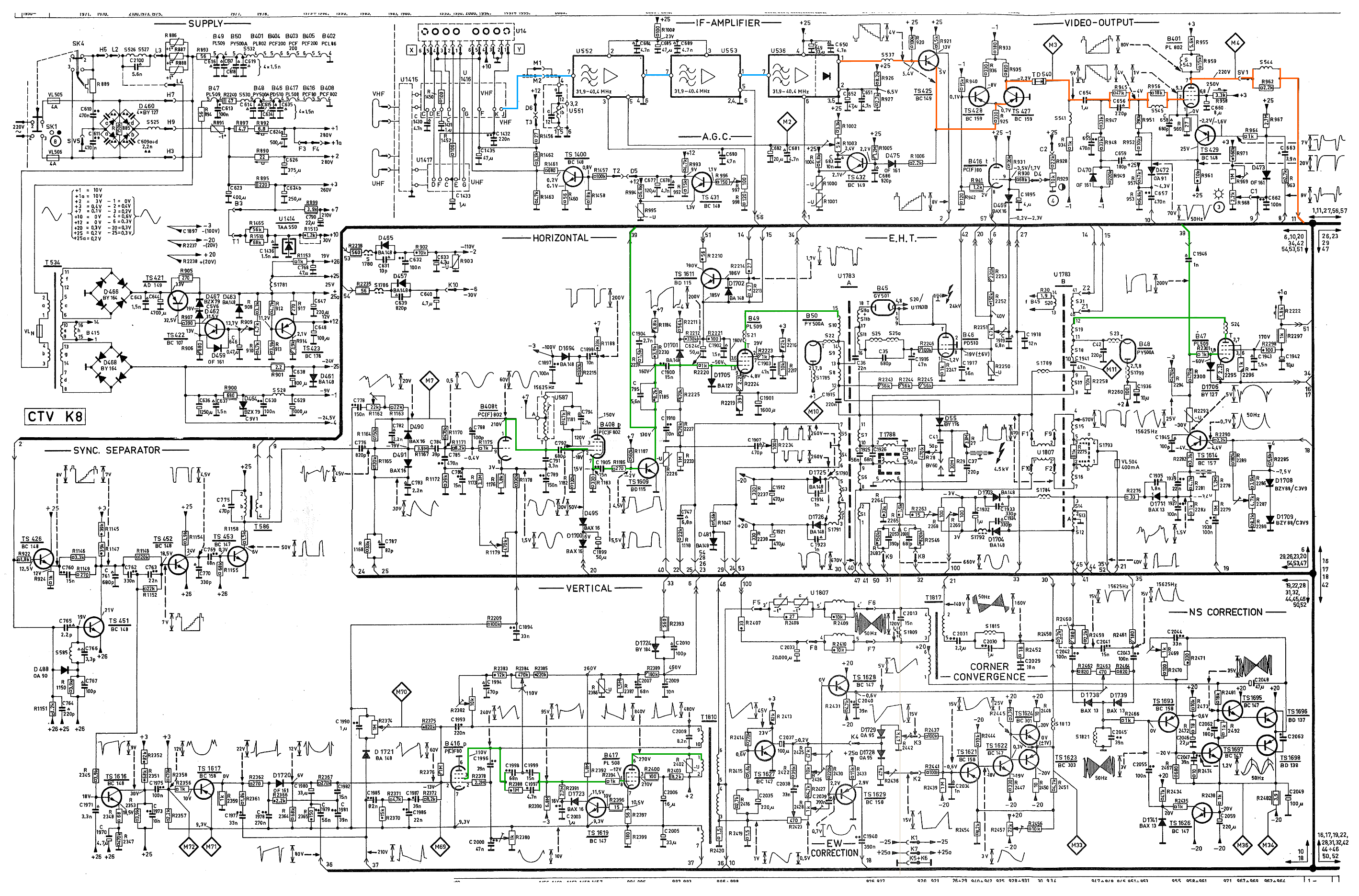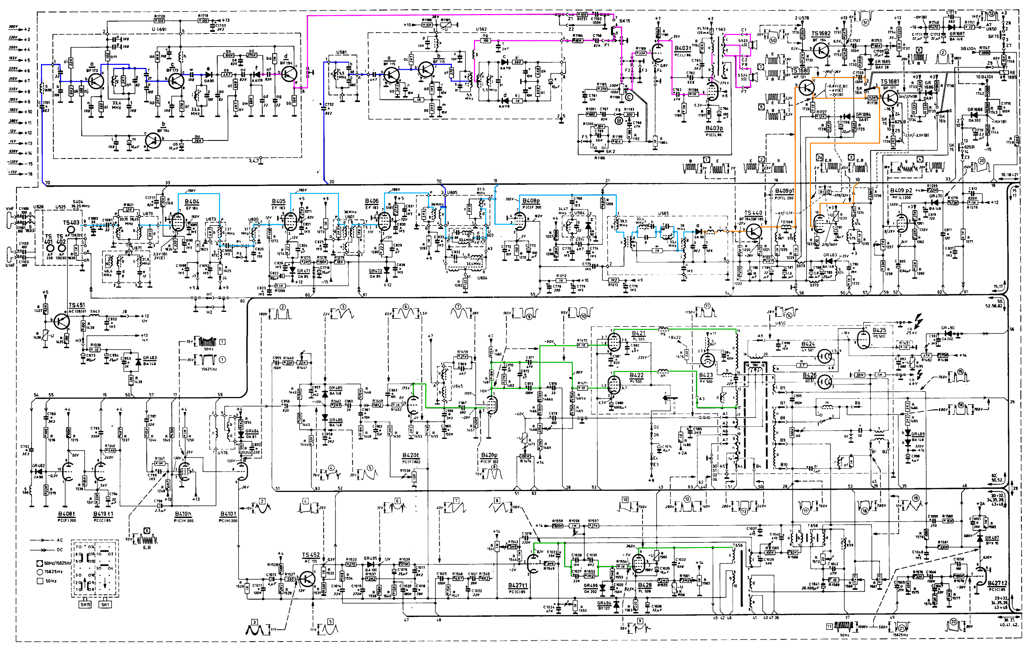 Chassis K6Dit eerste chassis gebruikt een hybride technologie (buizen en transistoren), maar met voornamelijk buizen. Omdat het toestel een afbuighoek van 90° heeft moeten de afbuigstromen sterker zijn, maar ook de correcties moeten sterker ingrijpen. Toch volstaan passieve componenten voor de instellingen (regelbare weerstanden).Het beeld is duidelijk minder fel dan die van een zwart-wit televisie (die toen goed op punt was) en de mensen werden aangeraden televisie te kijken in een verduisterde ruimte. Het schaduwmasker slorpte ongeveer 70% van de electronen op. Er worden enkel transistoren gebruikt in het middenfrekwent gedeelte voor het geluid, in de eerste videotrap en in enkele kleurschakelingen. Voor het belgenland fabriceert men een chassis dat aangepast is aan de belgische norm (AM geluid en positieve beeldmodulatie). Deze belgische norm heeft nooit een CCIR-erkenning gekregen. De belgische norm werd geselecteerd door de knop op de positie "B" te zetten, terwijl de echte B-norm (CCIR B en G) geselecteerd werd op de positie "E". En de echte CCIR-E norm is in feite de franse 819 norm, die geselecteerd werd op de positie "F1". Volgt u nog? Gelukkig was het toestel enkel voorzien voor de PAL kleurennorm. In Engeland bestond deze uitvoering onder het chassis G6 die aangepast werd voor de engelse markt met de 405 lijnen (CCIR-A norm, enkel zwart-wit) en de 625 lijnen in kleur. De engelse 625 lijnen verschilde van de continentale 625 lijnen met een andere frekwentie van de geluidsdraaggolf (6MHz in plaats van 5.5MHz). Deze toestellen werden in Engeland gefabriceerd uitsluitend voor de lokale markt. Wat valt er speciaal aan te merken aan dit chassis? Er worden 4 middenfrekwent trappen gebruikt en er zijn twee gescheiden beelddetectie trappen gebruikt, één voor de helderheid, en één voor de kleurhulpdraaggolf en de geluidshulpdraaggolf. Het belgisch toestel heeft een extra AM trap voor het geluid en een omkeertrap voor het videosignaal. De AM trap is hier ook uitgerust met een noise gate die via de link besproken wordt. Dezelfde noise gate zal ook bij het K7 chassis gebruikt worden. De lijnuitgangstrap gebruikt twee vermogenpentodes die min-of-meer parallel werken (dit lukt niet zo goed als men twee verschillende pentodes gebruikt en men moest de balans heel nauwkeurig instellen om te vermijden dat één van de pentodes rood oplichtte). De vermogenspentodes (lijn) zijn een PL500 en een PL505 en een PL508 voor het raster. Er wordt een kleurverschilsignaal naar de beelduis gestuurd: de helderheid (zwart-wit) wordt naar alle cathodes gestuurd, terwijl het kleurverschilsignaal naar de roosters gestuurd wordt. Het was toen moeilijk om perfect lineaire schakelingen te bouwen en een fout zou snel opvallen door kleurfranjes in beeld. Door te werken met een helderheidssignaal met normale bandbreedte en drie kleurverschilsignalen met beperkte bandbreedte vallen de eventuele verschillen niet op. Deze manier van doen zal in de volgende chassis verder gebruikt worden, al betekent dit dat er een extra buis nodig is. Het helderheidssignaal passert door een kamfilter (TD560) om de kleurinformatie uit het helderheidssignaal te filteren. Deze filter zorgt eveneens voor een heel lichte vertraging van het helderheidssignaal ten opzichte van het kleursignaal. Dit is nodig omdat het kleursignaal met zijn beperktere bandbreedte een langere looptijd heeft.