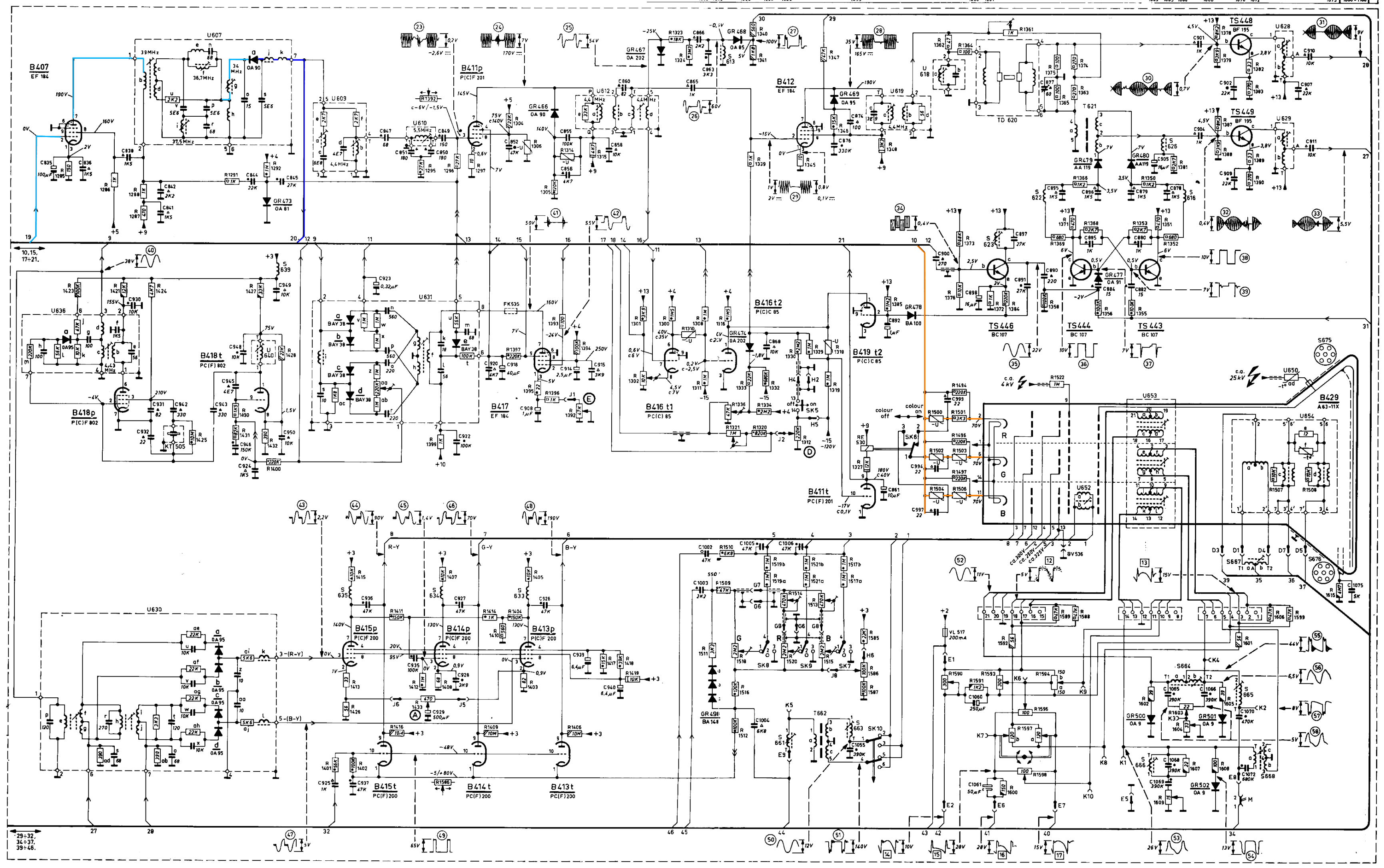 Chassis K8Bij het chassis K8 wordt er voor het eerst een afbuiging van 110° gebruikt voor de beeldbuis. De correcties moeten sterker uitgevoerd worden en men gebruikt aktieve schakelingen met transistoren. Het verbruikt stijgt weer tot 400W.De rastereindtrap is nog steeds een PL508 maar de lijneindtrap is gescheiden: een deel afbuiging en een deel hoogspanning, waarbij beide delen een PL509 gebruiken (deze buis zal tijdens de productie vervangen worden door een zwaardere PL519.