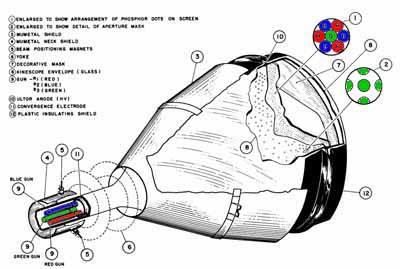 Het onderzoek rondom kleurtelevisies begint na de tweede wereldoorlog. De eerste testen worden gedaan met drie beeldbuizen die met kleurfilters uitgerust zijn en die het signaal naar een scherm projecteren door middel van een lenzenstelsel. Het grootste probleem is immers een systeem te vinden om kleur weer te geven met één enkele beeldbuis. Bij een ander systeem werd er met één enkel kanon gewerkt en een rooster dat de electronenstroom naar de corresponderende fosfor afbuigde. Het rooster was geplaatst op korte afstand van de fosforlaag, die uit stroken bestond. De stroken gaven groen, blauw of rood licht. Er was echter een hoog vermogen nodig voor deze afbuiging. De afbuiging was ook redelijk hoogfrekwent en stoorde de werking van het toestel. Uiteindelijk gaat men een schaduwmasker gebruiken die dicht tegen het scherm (fosforlaag) geplaatst wordt. De beeldbuis (in die tijd werden beeldbuizen kinescope genoemd) heeft drie electronenkanonnen, en ieder kanon "ziet" enkel zijn corresponderende kleur door het masker. Deze eerste buizen hadden een afbuighoek van 50°. De fabricage was complex en geen enkele buis uit die periode werkt nog op dit ogenblik. De buizen bestonden uit twee delen die op het einde van het fabricageproces aan elkaar gelast werden. De hoogspanningsanode (genaamd ultor in de Verenigde Staten) vormde een metalen ring rond de buis en moest degelijk afgeschermd worden. De beeldkwaliteit was toen opmerkelijk goed voor een eerste ontwerp, maar de levensduur van de beeldbuizen was niet goed. Zelfs na de komst van de kleurenbeeldbuis heeft men een projectiesysteem gebruikt in bepaalde televisietoestellen. Dit was de enige mogelijkheid om een relatief groot beeld te hebben. Het scherm maakte deel uit van de televisie en werd bekeken door transparatie, waardoor het optisch rendement niet goed was. Dit was het tijdperk van de Philips projectietelevisies. Er bestonden ook echte videoprojectoren (met name die van Barco), maar die moesten vast opgesteld worden, want de convergentie-instellingen moesten opnieuw uitgevoerd worden na verplaatsing. Het is pas met de komst van de LCD en DLP projectoren dat men een gemakkelijk verplaatsbaar systeem had. Het aards magnetisme moet gecompenseerd worden, want die buigt de electronen af van hun ideale weg. De electronen afkomstig van het groene kanon vallen niet meer op de groene fosfors, maar bijvoorbeeld op de rode. Men gebruikt daarvoor een metalen scherm die het magnetisch veld afschermt, maar dit scherm heeft de neiging zelf magnetisch te worden (mensen die zich bezig houden met de demagnetisatie van militaire schepen weten waarover ik het heb). Oorspronkelijk was het scherm voorzien van een spoel waardoor er een constante stroom gestuurd werd. De stroom moest bijgesteld worden iedere keer dat de televisie verplaatst werd. Later ging men een sterke wisselende spanning door de spoel sturen. Men gebruikt hiervoor een NTC-weerstand die een lage ohmse waarde heeft bij lage temperaturen (de stroom is dan maximaal), maar de weerstand stijgt snel waardoor de stroom nagenoeg nul wordt. De NTC-weerstand is een component die vaak defekt ging. Moderne plasma, LCD en LED schermen hebben zo'n schakeling natuurlijk niet meer nodig. De metalen afscherming was eerst aan de buitenkant van de beeldbuis geplaatst, maar wordt later in de beeldbuis zelf ingebouwd. Sony heeft lang een exsterne afscherming gebruikt. Nadat er proeven gedaan werden met een rastersekwentieel kleursysteem, stapt men resoluut over op het NTSC systeem ontworpen door RCA. De eerste uitzendingen starten in 1954. Het eerste televisietoestel uit die tijd is de CT-100. Dit toestel was nogal duur en er werden er niet zoveel van verkocht. De prijs lag driemaal hoger dan een monochroom toestel, terwijl de meeste programma's nog in zwart-wit uitgezonden werden. Het ontwerp is bijzonder goed: de ingenieurs zijn niet over een nacht ijs gegaan. Het ontwerp is strikt gebaseerd op de normen. Latere ontwerpen zullen bepaalde deelschakelingen niet meer gebruiken. Dit is ook het geval met de PAL norm, die bepaalde kenmerken van de NTSC norm niet gebruikte, maar andere deelschakelingen in de plaats gebruikte.
