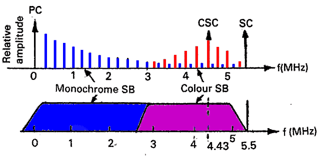 ![]() Het gebruik van een kleur hulpdraaggolf op 4.43...MHz zorgt ervoor dat het spectrum ervan tussen het spectrum van de helderheid komt te liggen (interleaving). Beiden signalen kunnen uit elkaar gehaald worden door een correcte filtering. En miljoenen Y/C kabels dat we verkocht hebben! Er was een kleine verbetering merkbaar, maar heel beperkt. |