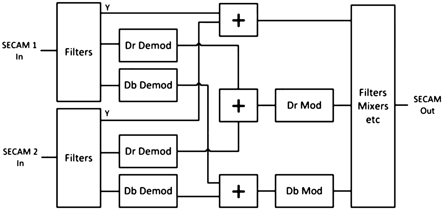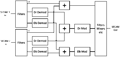 SECAMMaar terwijl het NTSC en PAL systeem fasegerelateerde amplitude modulatie gebruikt, gebruikt het SECAM systeem FM modulatie voor de kleurdraaggolf. De kleurinformatie is daardoor robuster (en dus minder gestoord als het antennesignaal zwak wordt, wat een voordeel is over lange afstanden), maar het zal later blijken dat deze FM modulatie voor talrijke problemen zal zorgen (in video-mengtafels bijvoorbeeld) De draaggolf (die altijd aanwezig is bij FM modulatie) veroorzaakt ook een storing in de helderheid. Het is dezelfde storing die men kan zien op een zwart-wit televisie (en zeker op een monitor met een veel hogere videobandbreedte) als men een PAL kleursignaal aanbiedt. Bij PAL is de storing enkel te zien op plaatsen waar er gesatureerde kleuren hadden moeten zijn (zie als voorbeeld beide testbeelden, de eerste op een televisie, de tweede op een monochrome computermonitor met een bandbreedte van 8MHz). Het FM signaal heeft een variabele amplitude (om de storingen van het zwart-wit beeld te beperken) en een pre-emphasis om de kleurovergangen scherper te maken. De aanwezigheid van een FM draaggolf in plaats van een AM draaggolf betekent ook dat twee synchrone composiet videosignalen niet gemixt kunnen worden (wat wel mogelijk is met PAL of NTSC). Een mengconsole moet dus noodzakelijk werken met het gedemoduleerd (Y, B-Y en R-Y) signaal. SECAM mengconsoles bestaan er niet. Het SECAM systeem werd ontwikkeld als tegenpool van het NTSC. SECAM werd vertaald als "Something exceedingly Contrary to the American Method" of "Système Elégant Contre les AMéricains" ("élégant" was het in ieder geval niet). Dit werd bereikt door