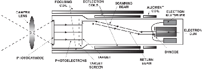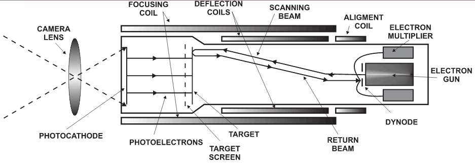 De eerste opnamebuizen, de "image dissector" gebruiken het foto-voltaisch effekt. Als fotonen een doel raken worden er electronen vrijgemaakt. Deze electronen worden aangetrokken tot de anode en een deflectiesysteem zorgt ervoor dat er op ieder moment slechts de electronen van een deel van het doel de anode kunnen raken. De andere electronen gaan verloren, waardoor de opnamebuis weinig lichtgevoelig is. Het systeem wordt enkel gebruikt om zeer heldere bronnen op te nemen en zal in de praktijk niet gebruikt worden voor de televisie. De iconoscoop gebruikt de weerstandsvariatie van een halfgeleider als die aan het licht blootgesteld wordt. Hier wordt de lading opgebouwd totdat de electronenstraal het doel op die plaats raakt. De electronenstraal laadt het doel op tot een hoge spanning. De belichte delen verliezen min of meer hun lading. Als het doel opnieuw geladen wordt door de electronenstroom ontstaat er een spanning op de target electrode die een maat is voor de verloren lading. In principe is dit een bruikbaar systeem, maar er zijn nog een paar nadelen: het beeld dat opgevangen wordt is gestoord door secundaire emissie: de electronenstraal de het doel oplaadt slaat electronen uit het doel weg (dit veroorzaakt ruis) en de resolutie is beperkt door de afmetigen van de lichtgevoelige puntjes. Een ander nadeel (dat later een rol zal spelen als men meer natuurgetrouwe weergave wenst) is dat er geen absolute lichtsterkte gematen kan worden. Het doel ("target") wordt gevormd door allemaal kleine condensatoren. Als een beeld donker is, dan levert de iconoscoop een grijs beeld: er is geen vast zwartniveau. De super-iconoscoop en de orticon zijn beide gebaseerd op dezelfde principes, het ene systeem wordt in Europa ontwikkeld en het andere in Amerika. Een doel dat door het licht geraakt wordt straalt electronen uit, die opgevangen worden door een niet-geleidend rooster op korte afstand daarvan. De electronenstraal die het rooster raakt veroorzaakt hier ook een secundaire emissie. Deze vrijgekomen electronen worden versneld door een electrode (dynode). De electronen gaan dan door een vermenigvuldiger. Het system is daardoor zeer gevoelig. Het systeem levert een zeer gedetailleerd beeld en zal in de studio gebruikt worden gedurende een 30-tal jaren. Maar het systeem is bijzonder complex, vergt talrijke afregelingen en heeft een zeer hoge spanning nodig. Een dergelijk systeem kan niet gebruikt worden voor amateur toestellen en voor ENG toepassingen (electronic news gathering). Daarom dat er lange tijd reportages gemaakt werden op 16mm film, de film werd dan in de studio ontwikkeld en gemonteerd. De vidicon opnamebuis is gebaseerd op de werking van de iconoscoop (verandering van de geleiding van een halfgeleider onder invloed van het licht) maar zonder de nadelen ervan. Het doel bestaat uit een laag halfgeleider, de electronen worden door een rooster afgeremd vooraleer ze het doel raken en de electronen raken het doel loodrecht. Deze opnamebuis heeft niet de goede eigenschappen van de orticon, maar is eenvoudig en werkt met relatief lage spanningen. Men experimenteert met andere soorten fotogevoelig materiaal en zo ontstaan er varianten op de vidicon: de plumbicon, de saticon, de newvicon, enz. Deze buizen zijn allemaal gebaseerd op hetzelfde principe en verschillende types buizen kunnen in één schakeling gebruikt worden als de nodige spanningen aangepast worden aan het gebruikt materiaal. De buis wordt in bewakingscameras gebruikt, en ook in de eerste videorecorders (met aparte camera- en recordergedeelte). De opnamebuis is vergelijkbaar met een beeldbuis, maar is kleiner gebouwd en de electronenstroom is veel lager. De electroden zijn de cathode, een stuurelectrode, een versnellingselectrode en een focuselectrode. Een fijnmazig net wordt juist voor het doel geplaatst en zorgt dat de electronen vertraagd worden. Dit net wordt meestal doorverbonden met de focusseringselectrode, maar er kan ook een extra aansluiting voorzien worden. Het doel (target) heeft een aparte aansluiting aan de zijkant zoals een normale beeldbuis, maar de spanning op het doel is laag.