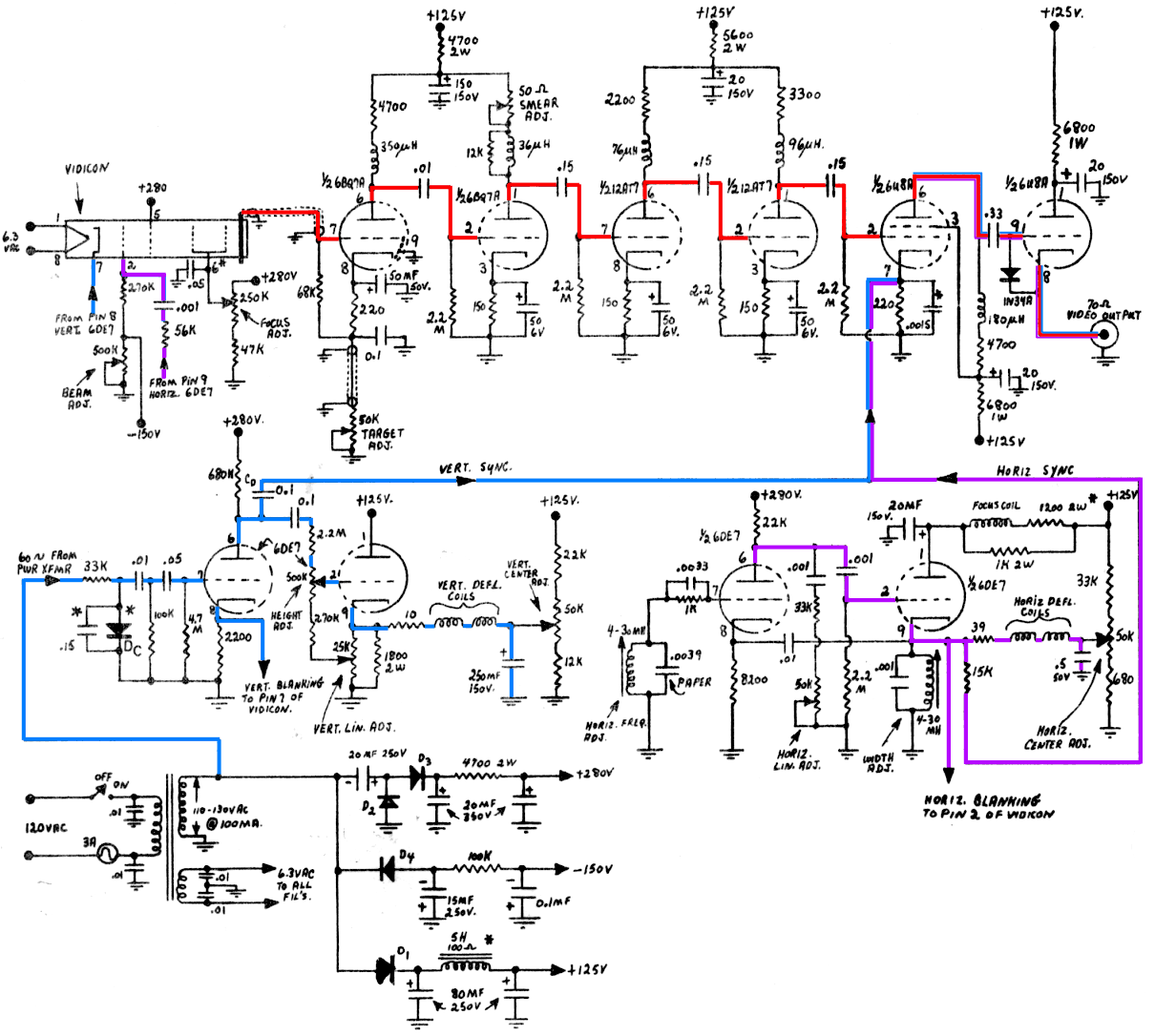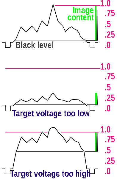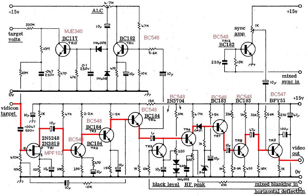 Instellingen van de vidiconbuisWe baseren ons op de schakeling rechts om de instellingen uit te leggen. De schakeling is een standaardschakeling die in veel bewakingssystemen gebruikt werd ("TV EYE").Het spanningsverschil tussen cathode en eerste electrode bepaalt de electronenstraal. Indien de straal te laag is kan het doel niet voldoende geladen worden (het vorig beeld wordt onvoldoende gewist). Er ontstaat een veegeffekt op heldere beeldelementen. De lage electronenstroom produceert ook een laag electrisch signaal, waardoor er meer versterking nodig is (en er dus ook meer ruis ontstaat). Indien de stroomsterkte te hoog is wordt de target vroegtijdig vernietigd. De spanning moet ingesteld worden volgens de waarden van de fabrikant, rekening houdend met de versnellingsspanning. Dit is een vaste instelling. De electronenstroom moet ook onderbroken worden bij de lijn en rasterterugslag om te vermijden dat het beeld gewist zou worden. Wordt de rasterterugslag niet onderdrukt, dan ziet men donkere strepen in beeld (bij een beeldbuis zijn dat heldere strepen). De opnamebuis krijgt dus de raster- en lijnpulsen op de stuurelectrodes. Er is ook een electrostatische focusregeling, zodat de electronenstraal het doel raakt als één enkel punt. Naast de electrostatische focusregeling is ook de optische focusregeling van belang, om een scherp optisch beeld te vormen op het doel. Sommige opnamebuizen hebben ook nog een electromagnetische focussering. Er loopt een kleine gelijkstroom door de spoel. Het doel (target) zit op een lage spanning om secundaire emissie tegen te gaan. De spanning kan vast zijn, of geregeld worden naargelang de beeldinhoud (electronische iris). Een lage spanning veroorzaakt een lage ontlaadstroom en het beeld is nauwelijks zichtbaar. Een te hoge spanning veroorzaakt een te hoge zwartstroom waardoor het bereik van de buis beperkt wordt. De targetspanning regelt zowel de versterking (contrast) als het niveau (helderheid) van het videosignaal. Om de mogelijke beschadiging van het doel tegen te gaan wordt soms de spanning van de opnamebuis onderdrukt als de lijn of rasterafbuiging wegvalt. Vaak wordt de hoogspanning opgewerkt door de lijneindtrap (zoals bij een klassieke beeldbuis). De afbuighoek is beperkt, de electronen bewegen relatief traag en de opnamebuis is klein: een heel beperkte stroom is voldoende voor de afbuiging. De schakeling die hier getoond wordt gebruikt de netfrekwentie voor de rasterfrekwentie en een vrijlopende oscillator voor de lijnfrekwentie. Dit systeem kan enkel gebruikt worden voor bewakingssystemen (CCTV) Het signaal van de target moet ongeveer 10.000× versterkt worden. De opnamebuis zelf produceert een zuiver signaal, en de ruisbijdrage wordt vooral geleverd door de versterkertrappen. Er worden afgestemde kringen gebruikt om de hoge frekwenties wat op te slingeren en het beeld scherper te doen lijken. Zonder deze correctie zou het beeld nogal flets zijn. Om een correct videosignaal te bekomen moeten er nog synchronisatiepulsen bijgevoegd worden (raster en lijn). Als het beeld niet afgetast wordt (onderdrukking van de electronenstraal) dat zit het videoniveau op een minimumwaarde (pedestal). Dit niveau, dat gemeten wordt juist na de synchronisatiepuls wordt in sommige monitoren gebruikt om de versterking in te stellen. Dit niveau kan veranderen ten gevolge van de temperatuur. De vidicon en aanverwanten zal verder gebruikt worden met transistorversterkers, zoals op het laatste schema die afkomstig is van een bouwkit om zelf een bewakingscamera te bouwen. Het schema vertoont gebreken maar toont aan