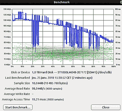 Si vous effectuez le test à nouveau au bout de quelques jours et vous obtenez une forme pratiquement identique, avec les pics vers le bas aux mêmes endroits, c'est que le disque a des parties défaillantes. C'est pratiquement impossible que les creux soient causés par un programme qui effectue exactement aux mêmes moments des opérations d'accès au disque.