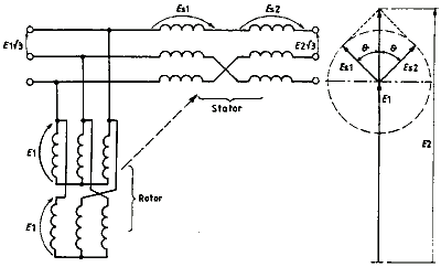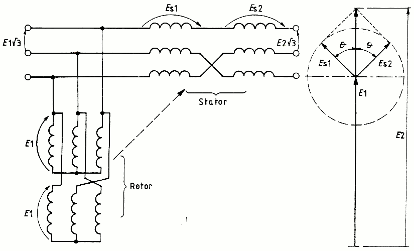 Régulateur à induction monophaséLes régulateurs à induction sont généralement conçus pour le triphasé, mais ils existent également en monophasé. Nous avons une entrée E1, un stator S et un rotor R.La tension en sortie est déterminée par la tension à l'entrée, à laquelle on ajoute la tension E2 qui peut être de même phase ou de phase inverse.