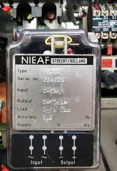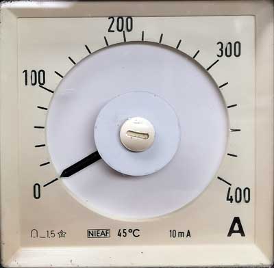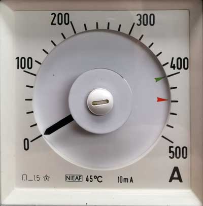 Pour commander un appareil de mesure, il faut transformer le courant alternatif en courant continu, ce qui est effectué par le petit convertisseur à droite. L'appareil de mesure est ici un milli-ampèremètre de 10mA, il faut donc transformer un courant alternatif de 5A (qui correspond à un courant alternatif de 400A au primaire) en courant continu de 10mA. Pour un courant de 10mA, on obtient une indication de 400A sur l'appareil de mesure. L'avantage de ce système, c'est que si on remplace une partie de l'installation (groupe électrogène plus puissant), il suffit de remplacer le transfo d'intensité (avec par exemple un rapport de 500A vers 5A) et la plaquette à l'intérieur du milli-ampèremètre pour indiquer 500A au lieu de 400A. Le reste de l'installation de mesure ne doit pas être adapté.