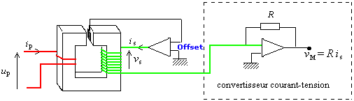 Les transformateurs d'intensité (TI) sont également utilisés dans la distribution d'électricité (hautes tension de 400kV), voir exemple à gauche. Il y a un transformateur d'intensité sur chaque phase, il permet de controler que la charge triphasée est équilibrée. Le courant dans les lignes de distribution haute tension est limité: avec un courant de 50A on transmet une puissance de 20MW, c'est suffisant pour alimenter une petite ville de 20.000 habitants. Mais en général, on alimente les villes via plusieurs arrivées sur le réseau moyenne tension (70kV). Le transformateur d'intensité est associé à un transformateur de tension (TT) dans les installations de distribution. La mesure de la tension se fait toujours entre la phase et le neutre. Le secondaire produit une tension référencée au neutre. Mesure du courant continuPour mesurer du courant continu, on utilise également une sorte de transfo d'intensité, mais avec une sonde hall qui mesure le champ magnétique. La sonde de Hall peut aussi bien mesurer les champs constants qu'alternatifs.Le problème inhérent des sondes hall qui est la nécessité d'avoir une alimentation est résolu de façon très élégante par une boucle 4-20mA qui apporte la puissance nécessaire pour faire fonctionner l'électronique de mesure. Pour éviter des erreurs de mesure (non-linéarité, hystérésis,...) on ne mesure pas le champ magnétique produit par le conducteur, mais on mesure le courant nécessaire pour contrecarrer le flux induit. Le bobinage de compensation a beaucoup de spires, pour qu'un très faible courant soit suffisant pour contre-carrer le champ primaire. Le transfo d'intensité travaille donc à flux nul où la mesure est plus précise. Le seul inconvénient d'une telle mesure, c'est que le transfo d'intensité peut avoir un magnétisme rémanent qui fausse la mesure du courant continu. Il est compensé par un réglage d'offset, ce réglage doit se faire sans courant dans le conducteur de mesure ("primaire").