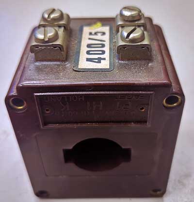 ![]() Convertisseur pour appareil de mesureUn transfo d'intensité classique produit un courant alternatif proportionnel au courant dans le fil de mesure. Un transfo d'intensité transforme par exemple un courant de 400A en courant de 5A (sous 6kV cela fait tout de même une puissance de 2400kVA). Le primaire est ici une grosse barre de cuivre qui passe au milieu du transfo. Le transfo d'intensité isole le primaire (haute tension et courant important) en un courant de faible amplitude isolé du réseau.