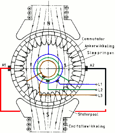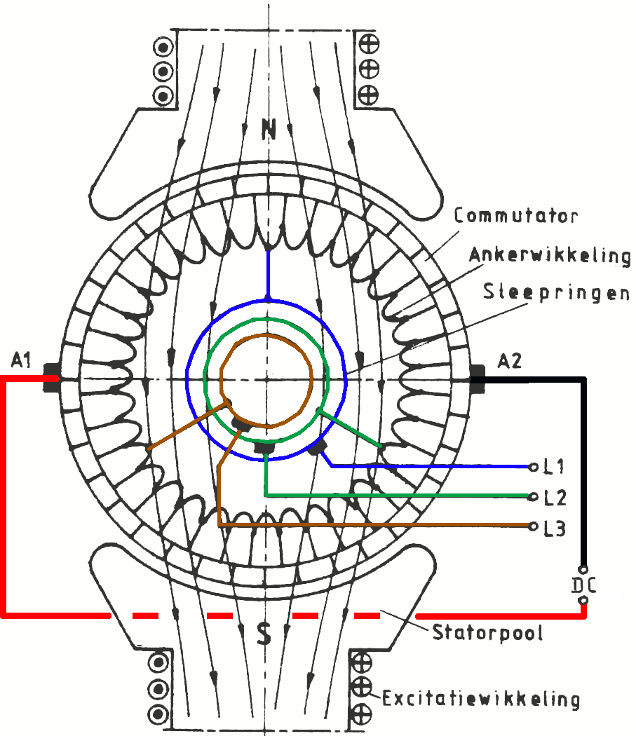 CommutatriceLa commutatrice est une combinaison d'un moteur et d'un générateur, mais n'utilise qu'un seul rotor.Le stator produit l'excitation, mais contrairement à un générateur sa tension ne détermine par la tension en sortie: l'excitation sert uniquement à permettre au moteur de tourner. Dans certains cas, l'augmentation de l'excitation permet d'améliorer le facteur de puissance et même de fournir de la puissance réactive au réseau alternatif (courant déwatté). Le rotor a un bobinage qui est à la fois connecté comme une dynamo (avec de nombreuses connections vers les lamelles du commutateur) et comme un moteur à cage bobinée avec 3 branchements équidistants qui vont à une bague. Dans le cas d'un fonctionnement en redresseur (cas le plus probable), l'alternatif triphasé arrive aux bagues via trois frotteurs et le continu est récolté par deux balais. ![]() La commutatrice fonctionne comme un autotransformateur dont les balais prélèvent toujours la tension redressée. C'est la rotation synchrone qui fait que la tension continue apparait toujours aux même endroits. La commutatrice est mise en route sans charge avec une tension alternative réduite, les grosses commutatrices ont un moteur de démarrage. On peut également la faire démarrer comme moteur à courant continu, mais cela nécessite un système de commutation plus complexe. La commutatrice doit tourner en synchronisme avec le réseau. Du point de vue mécanique, la commutatrice travaille toujours à vide. Le courant d'excitation qui peut être assez faible ne sert qu'à permettre la rotation du moteur. On aurait tout aussi bien pu utiliser des aimants permanents, mais ceux-ci n'étaient pas assez puissants à cette époque. Pour limiter l'usure des balais, on fait tourner le convertisseur à la vitesse la plus basse possible, par exemple 750 tours/minutes. Comme le convertisseur tourne en synchronisme avec le réseau, une vitesse de rotation plus basse nécessite un nombre de pôles plus importants et une construction plus complexe. Les commutatrices étaient principalement utilisées pour fournir du courant continu au matériel ferroviaire: il était plus facile de régler la puissance d'un moteur continu que d'un moteur alternatif. Actuellement encore, les trams sont alimentés en continu sur de nombreuses lignes. On les a également utilisées pour produire dun continu dans certaines applications: ascenseurs pour charbonnages avant l'utilisation de groupes Ward Leonard, galvanoplastie et électrolyse,... En comparaison d'un groupe Ward Leonard qui était utilisé pour alimenter un seul gros moteur, la commutatrice était utilisée pour créer un second réseau électrique auquel différents moteurs pouvaient être branchés.