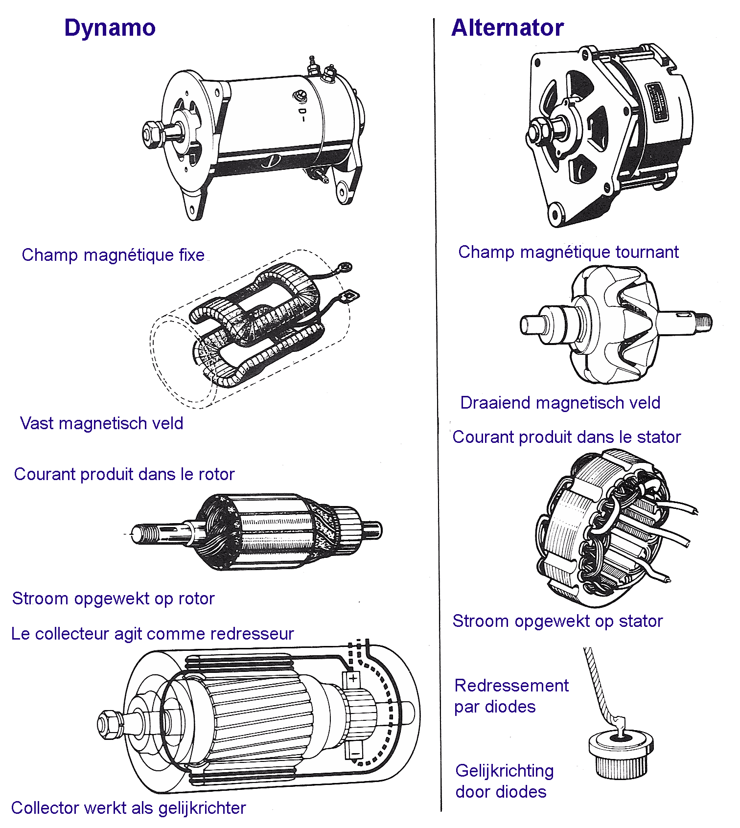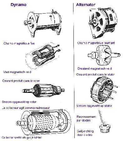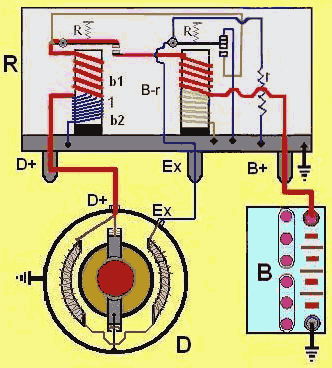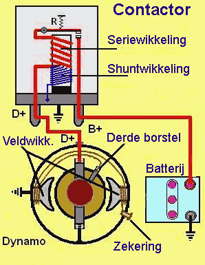 La dynamo de voiture est une dynamo shunt dont le courant d'excitation est commuté entre une valeur normale et une basse valeur. La dynamo nécessite également un module (conjoncteur/disjoncteur) qui empèche le courant de circuler de la batterie vers la dynamo (la transformant en moteur) quand le moteur à explosion ne tourne pas. C'est le relais à gauche dans le premier schéma et le seul relais dans le second schéma. Le conjoncteur/disjoncteur se compose d'un relais avec deux bobinages, l'un en série, l'autre en parallèle. C'est l'ancètre du disjoncteur à retour de puissance utilisé dans les centrales electriques et les groupes électrogènes synchronisés.