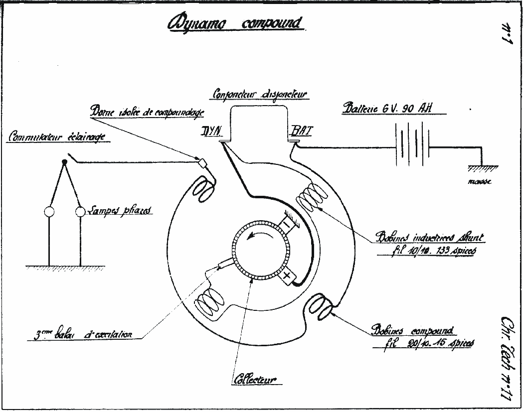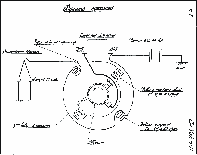 Sortie séparée pour les pharesLes automobiles n'avaient pas d'accessoires électriques: pas de sièges chauffants, pas d'ordinateur de bord, pas d'autoradio, même pas de feux arrières ou de clignotants. Les seuls utilisateurs étaient les phares et ils n'étaient disponibles qu'en une seule version: "normale"Certains régulateurs étaient équipés d'une sortie séparée pour alimenter les phares, tandis que la sortie principale alimentait la batterie, ce qui permettait une meilleure régulation. Il était tout à fait normal que les phares ne fonctionnaient que quand le moteur tournait: la batterie servait uniquement à faire démarrer le moteur. La dernière version présentée ici iest une version à bobinage compound dont le bobinage série était parcouru par le courant des phares. Quand ceux-ci étaient allumés, le courant dans le bobinage série augmentait le champ magnétique permettant ainsi à la dynamo de fournir un courant plus important pour alimenter les phares et charger la batterie. Cette version n'avait pas besoin de régulateur: le bobinage série permettait d'augmenter le courant quand les phares étaient allumés et de troisième balais permettait de stabiliser le courant indépendamment du régime du moteur. Et puis finalement on est passé à l'alternateur qui a de nombreux avantages dès qu'on a pu disposer de diodes de redressement suffisamment fiables et de puissance élevée. |