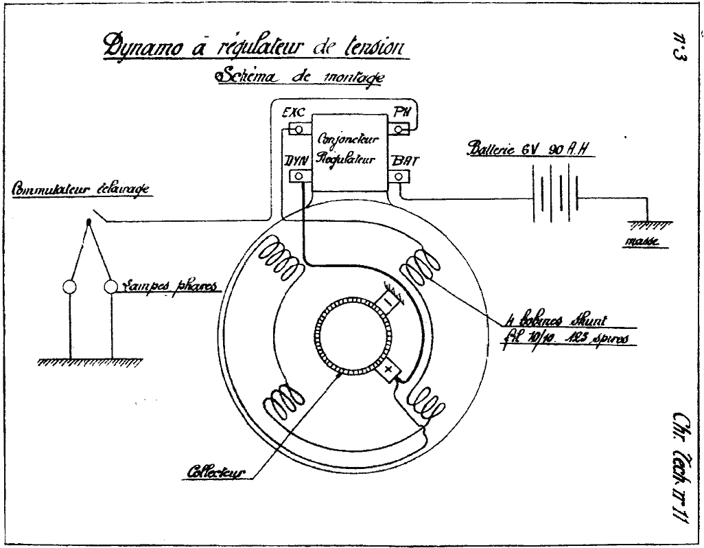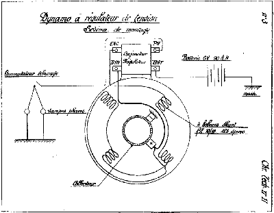Dynamo à trois balaisEn plus de la dynamo de voiture classique à excitation shunt séparée, on a utilisé des dynamos à trois balais. Le troisième balais peut être plus fin, car il ne sert qu'à fournir le courant d'excitation. Le balais est monté sur un anneau qui peut être tourné, ce qui permet de modifier la position du balais, et donc également la tension engendrée.La dynamo à trois balais utilise la réaction d'induit pour réduire automatiquement la tension d'excitation (et donc limiter le courant en sortie). Quand le moteur tourne à vitesse plus élevée et a tendance à fournir une tension plus élevée, le déplacement du champ magnétique agit ici aussi pour limiter la tension en sortie. La dynamo avec trois balais a été utilisée jusqu'à la seconde guerre mondiale, et puis on a donné la préférence à un régulateur qui permet une meilleure stabilisation. L'anneau devait être déplacé deux fois par an, pour compenser la demande en courant plus importante en hiver. La dynamo à trois balais ne permet pas une bonne stabilisation de la tension (uniquement une limitation du courant). Bien que l'excitation forme un circuit séparé, le comportement de la dynamo reste celui d'une dynamo shunt en ce qui concerne la tension: quand la tension augmente (batterie chargée, épuisée ou mauvais contacts) le courant augmente également. Il fallait régulièrement ajouter de l'eau distillée dans les batteries pour compenser l'électrolyse. Mais le système n'était pas plus mauvais que le système à régulateur qu'il fallait régulièrement ajuster. Les installations étaient en 6V et un mauvais contact avait plus d'influence que sur un système en 12V.