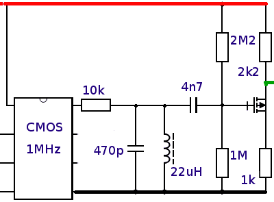 La sortie est envoyée à un circuit accordé sur la fréquence de l'oscillateur pour linéariser le signal en sortie de l'oscillateur. Il est recommandé de placer le circuit accordé dans un petit boitier métallique relié à la masse. Ensuite, le signal est envoyé à un transistor mosfet qui sert principalement d'étage tampon. Selon l'amplitude désirée du signal, celui-ci peut être récolté sur le drain ou la source.