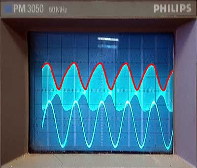 Défauts de la modulation par transistorEn rouge, le signal démodulé (enveloppe). Les déformations ne se remarquent pas tellement à cause de la bande passante très limitée des récepteurs AM. Les déformations étant des harmoniques, elles sont filtrées par le premier étage basse fréquence. La caractéristique non-linéaire de la jonction (qui permet la modulation) fait également qu'il n'est pas possible d'atteindre une modulation maximale. La déformation augmente avec le niveau de la modulation. C'est surtout le cas si l'étage modulateur est utilisé en étage de puissance. Ce type de modulateur est principalement utilisé dans les très basses puissances, par exemple dans le changement de fréquence d'un récepteur hétérodyne. Le changement de fréquence est également une sorte de modulation, où on mélange le signal d'antenne préalablement amplifié à un oscillateur local. Le circuit avec un transistor fonctionne, mais quand on augmente la modulation, la déformation augmente brusquement. C'est déjà visible sur l'oscilloscope avec une modulation de 30%, cela s'entend avec un taux de modulation de 50%. Il est possible d'augmenter le taux de modulation en réduisant l'amplitude de la porteuse, mais alors la portée de l'émetteur est vraiment très limitée. Un circuit plus élaboré par modulation par l'alimentation est donné page suivante. |