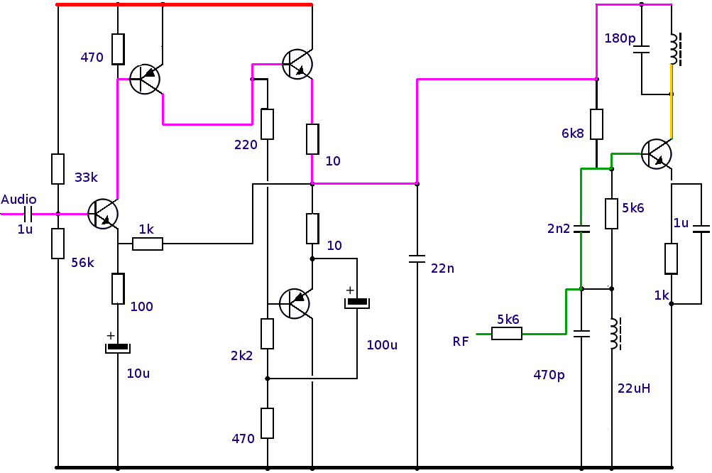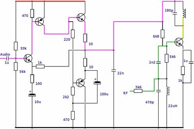 Nous voici à la version 2 de notre émetteur. Il utilise la modulation par la tension d'alimentation, qui est un principe qui a été utilisé très longtemps par les émetteurs de radiodiffusion. |