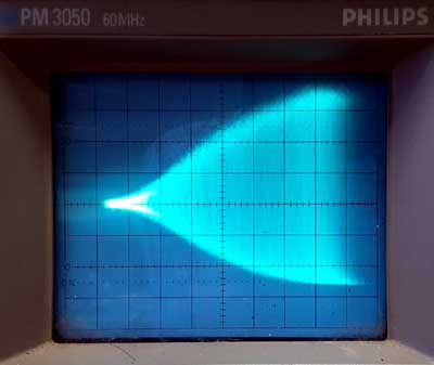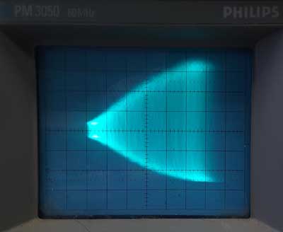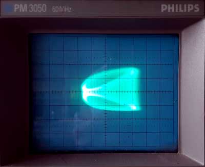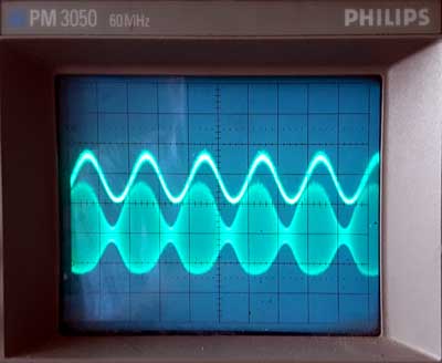 On remarque également une asymmétrie dans la modulation: les tops positifs (enveloppe) sont normaux, tandis que les tops négatifs sont aplatis. C'est causé par la non-linéarité du montage. Plus on tente d'augmenter la puissance, et plus l'effet est présent. Il se remarque aussi bien sur le tracé de l'enveloppe classique que sur le tracé du trapèze. Le montage décrit sur cette page a éliminé un problème du circuit précédent (taux de modulation limité) mais a toujours un second problème, un manque de puissance. Pour avoir un fonctionnement optimal, il faut séparer les fonctions: le modulateur (la partie basse fréquence), l'étage mélangeur et finalement l'étage de puissance haute fréquence: émetteur AM trois étages. Les images d'oscilloscope (aussi bien l'enveloppe que le trapèze) sont expliquées sur cette page.