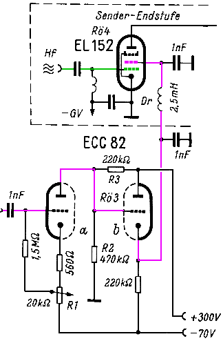 Les vrais bricoleurs (comme moi) ont tous fabriqué un émetteur radio avec un tube PL504 ou PL509 (en provenance du circuit ligne d'un téléviseur à lampes). On peut obtenir sans problème une puissance d'émission d'une trentaine de watts effectifs, lisez les pages suivantes pour plus de détails. La modulation par la grille-écran n'a pas besoin d'un signal audio de forte puissance: une triode ECC82 est suffisante pour fournir le signal modulant à la pentode haute fréquence. Un montage avec pentode modulatrice permet en plus de jouer sur les caractéristiques de l'émetteur (faites une recherche google "carrier controlled modulator") où le signal modulant modifie les caractéristiques du tube d'émission: quand le signal audio est faible, l'émetteur fonctionne à relativement basse puissance (et a donc un index de modulation élevé), tandis que quand le signal audio est fort, l'émetteur fonctionne à puissance maximale. Ce type de modulation est surtout utilisé en ondes courtes car il permet un rendement élevé, mais il est maintenant également accepté en ondes moyennes (petites ondes en France). |