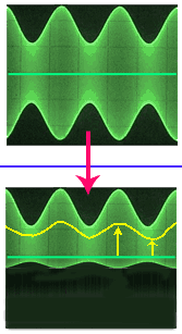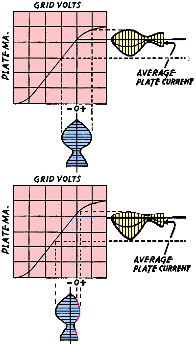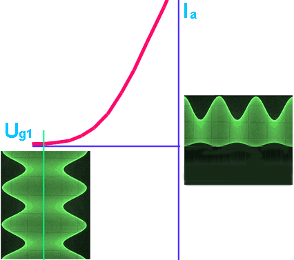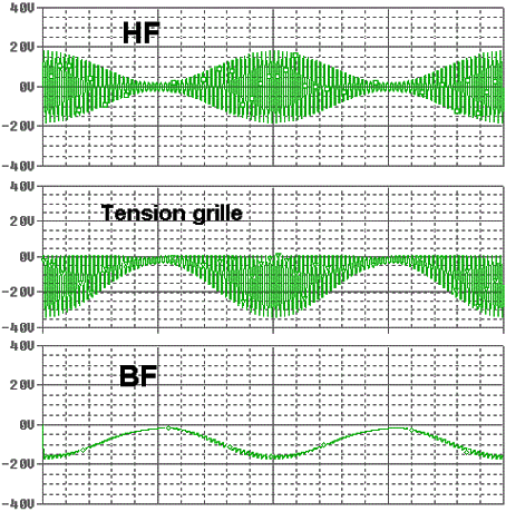 On fait l'inverse pour la détection par la caractéristique de la plaque. On va polariser la grille très négativement pour que le tube ne soit en conduction que pour les alternances positives du signal radiofréquences. Nous avons ici aussi une détection, car le signal en sortie est devenu asymmérique.