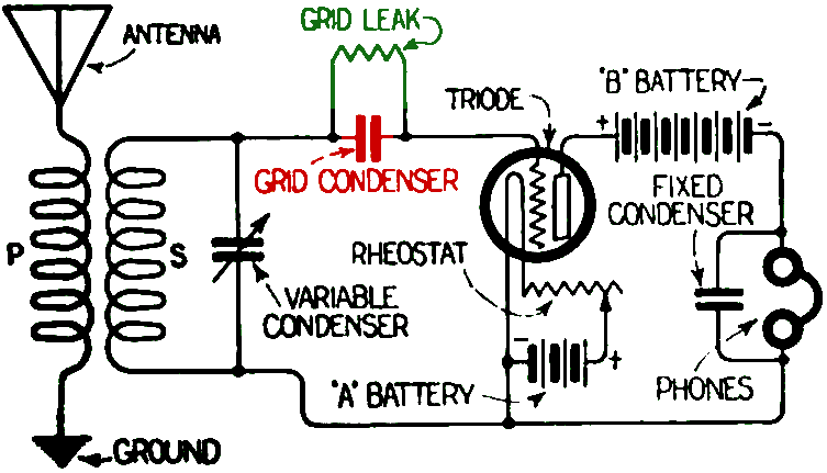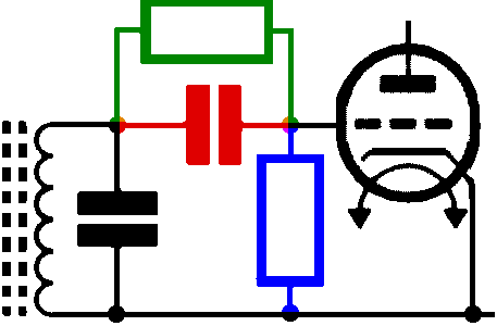 La cathode émet des électrons dont une partie se dépose sur la grille qui devient légèrement négative. Les électrons peuvent s'échapper par la résistance de fuite. Quand on met un faible tension alternative sur la grille elle va conduire un peu plus pendant les alternances positives et moins (ou pas du tout) pendant les alternances négatives. La tension sur la grille devient de ce fait un peu plus négative. Une tension se forme aux bornes du condensateur et la charge peut s'échapper via la résistance. La grille est à un potentiel légèrement négatif, qui devient plus négatif quand le signal d'un émetteur est reçu.