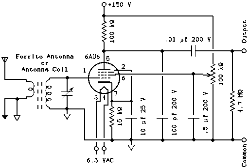 La détection par la caractéristique de la grille est basée sur l'effet de diode entre la cathode et la grille. Notre triode a un effet diode, donc pourquoi ne pas l'utiliser. Tous les circuits qui utilisent la détection par la grille ont un condensateur de faible valeur (rouge) et une résistance de valeur élevée (verte ou bleue).