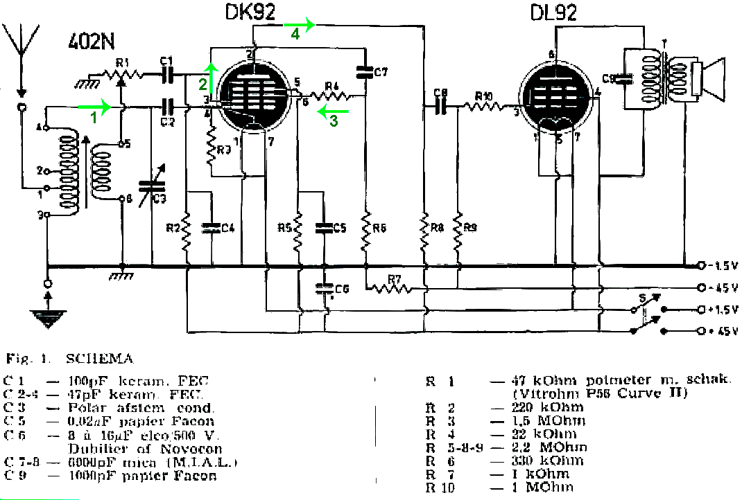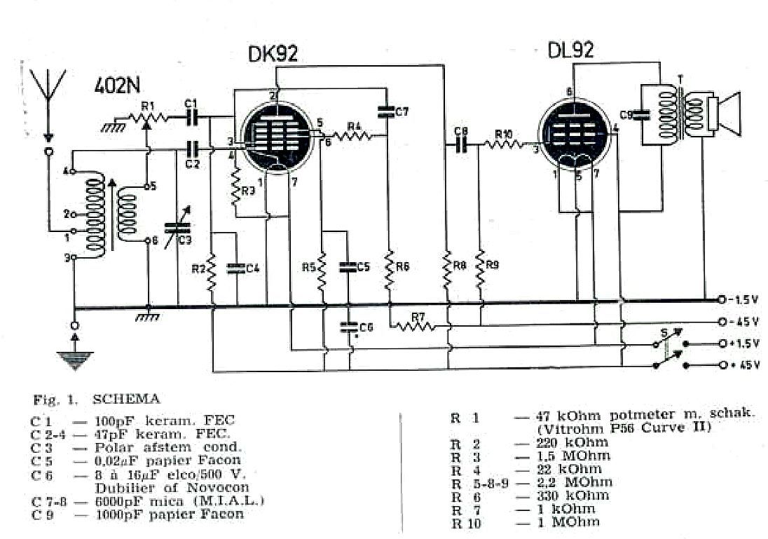 Circuit comme example à analyserCe circuit a été conçu après la seconde guerre mondiale mais utilise une technologie plus ancienne permettant de réaliser plus facilement le récepteur. Ce circuit utilise des lampes lancées après la seconde guerre mondiale pour les appareils portatifs. La radio utilise des lampes à chauffage direct, ce qui permet de réduire la puissance de chauffe. Le circuit a été conçu par De Muilderkring, un éditeur de revues d'électronique qui fournissait également les composants nécessaire à la réalisation des appareils présentés.