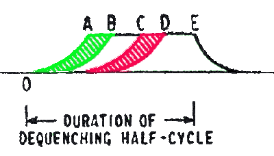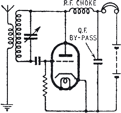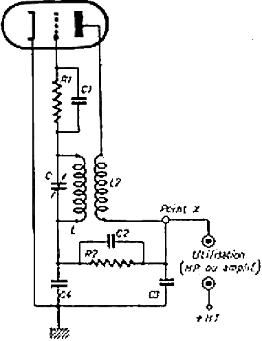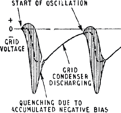 En E l'amplification de la lampe est réduite et les oscillations sont amorties et disparaissent. Ce circuit a de bonnes caractéristiques, notament un controle du volume incorporé (la détection est logaritmique, ce qui réduit les différences entre la puissance des émetteurs). Les parasites sont également bien éliminés, ils ne permettent normalement pas de lancer l'oscillation. Mais l'oscillation démarre même quand il n'y a pas de signal à l'antenne, et le récepteur produit un bruit caractéristique (crépitement) en l'absence de signal. Comme le récepteur est basé sur l'oscillation spontanée, il faut un étage préliminaire (amplificateur radio-fréquences) qui va isoler le circuit oscillant du circuit d'antenne. Une fois que l'oscillation est lancée, le récepteur n'est plus du tout sensible au signal d'antenne et l'oscillation continue à perpétuité s'il n'y a pas de système pour atténuer l'oscillation. Il existe deux systèmes pour assurer l'extinction de l'oscillation: le système à polarisation variable et l'oscillateur indépendant.