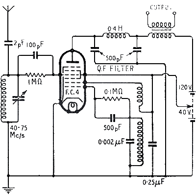 Système à oscillateur indépendant On utilise souvent un oscillateur séparé qui produit un signal d'amplitude de plus de 10V sur la grille de la triode, mais on peut également utiliser une octode, dont la partie oscillatrice est utilisée pour moduler le courant dans la partie pentode (circuit à droite). Le tube utilisé ici est une FC4, une octode anglaise avec arrivée du signal d'antenne sur la grille 4 (avec contact sur le haut du tube). La partie oscillatrice (avec la grille 1 et la grille 2 comme anode) module fortement le courant qui arrive à la partie pentode. Quand le courant est faible, la partie pentode ne peut plus entretenir les oscillations. Le circuit utilise une octode, mais on pourrait probablement un même type de circuit avec une triode-heptode, mais ce tube de conception plus récente n'existait pas encore à cette époque.