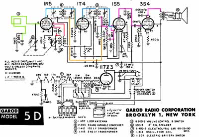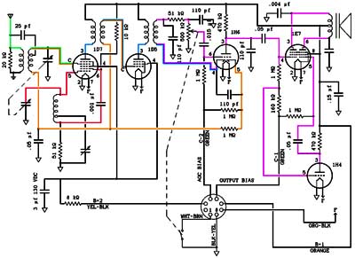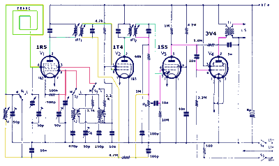 Le premier étage est ici aussi un convertisseur pentagrille (1R5), mais la construction est différente et le signal d'antenne n'est pas isolé électrostatiquement du signal de l'oscillateur. La grille-écran est en fait l'anode de l'oscillateur local. Cette construction permettait de faire travailler le tube à des fréquences plus élevées (20MHz), ce qui n'est pas nécessaire ici. Le tube a une grille suppresseuse, ce qui n'est pas vraiment nécessaire à ces tensions relativement basses. Le second étage est un amplificateur de la fréquence intermédiaire (pentode 1T4), qui peut éventuellement aussi être utilisé pour la basse fréquence. Le tube permet un branchement série ou parallèle de la tension de chauffage (1.4V, 50mA) Nous avons ensuite une diode-pentode 1S5, la diode sert pour la détection du signal audio et le controle automatique du volume, tandis que la pentode est un tube amplificateur basse fréquence avec un gain de 40×. La tension de polarisation négative est obtenue avec une résistance de fuite de 10MΩ. La pentode de puissance est un 3S4 qui peut fournir une puissance audio de 180mA avec une tension d'alimentation de 67.5V. Nous avons une résistance cathodique non découplée qui produit une chute de tension d'environ 7V, ce qui réduit encore plus la puissance disponible. Il y a également une résistance de polarisation commune dans la ligne d'alimentation négative. Le système est relativement simple pour le fonctionnement sur piles: nous avons une pile haute tension de 67.5V (consommation d'environ 5 à 7mA) et une pile de 7.5V pour le chauffage (50mA), tous les filaments étant alimentés en série. Ceal devient plus complexe en fonctionnement sur secteur. Nous avons une diode de redressement 117Z3 spécialement conçue pour cette application. Ce tube peut directement êtrte branché sur le secteur pour la tension de chauffage. Ce tube peut fournir un courant relativement important car il doit également fournir la tension de chauffage des tubes de la radio. Avec la consommation de la haute tension en plus, on arrive à un courant de 60mA. Cette diode n'est en fonction qu'avec une alimentation sur secteur. La tension de secteur redressée est d'abord réduite à une tension adaptée à la radio, et puis à nouveaui diminuée pour l'alimentation des filaments. Il y a plusieurs électrochimiques dans l'alimentation pour réduire le ronflement: 60µF, 25µF et 150µF. Ces valeurs relativement élevées sont nécessaire car le courant à filtrer est plus important qu'avec une radio normale. Tous les tubes à chauffage direct doivent être alimentés en continu filtré.