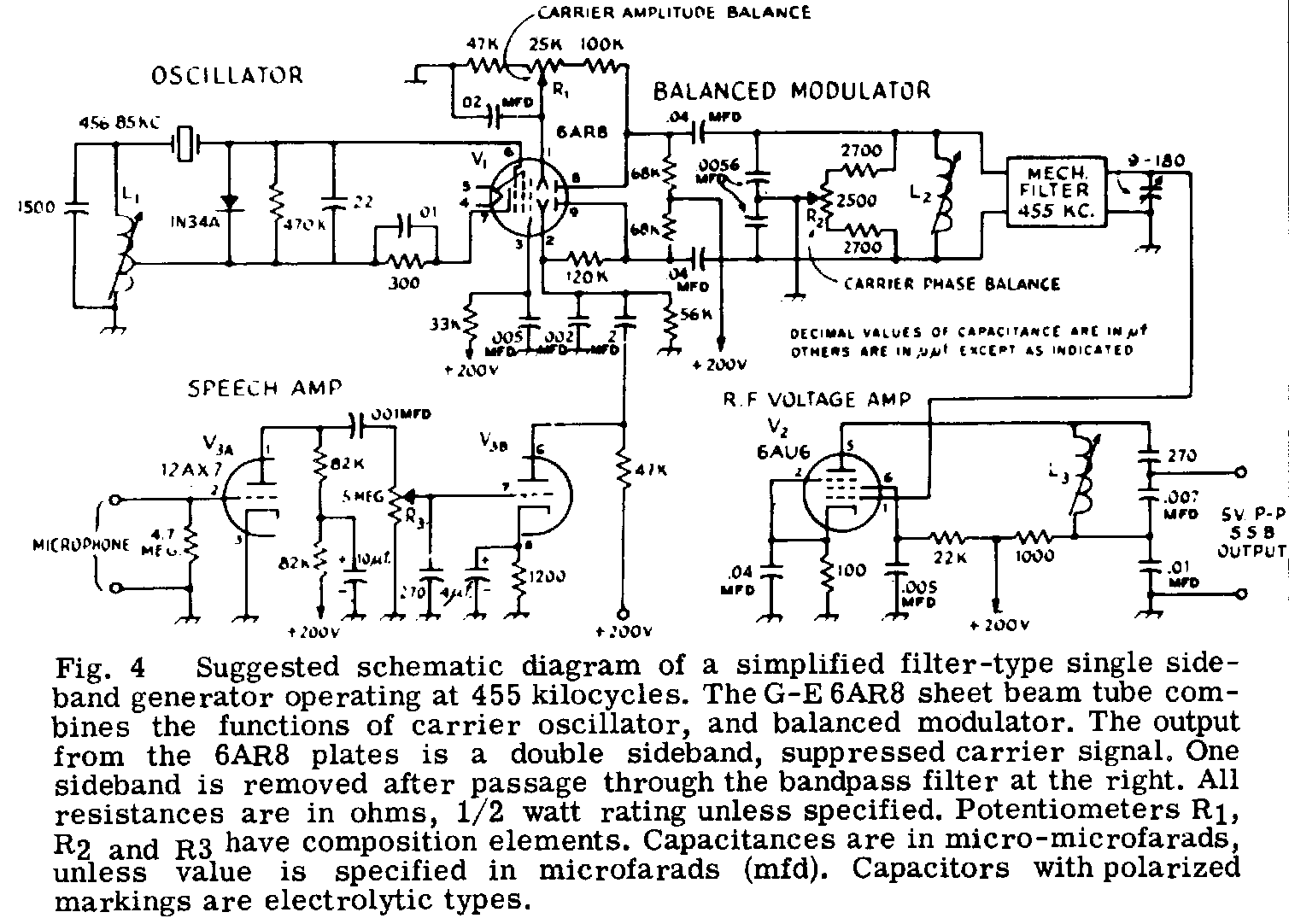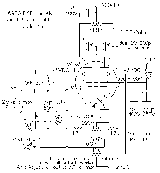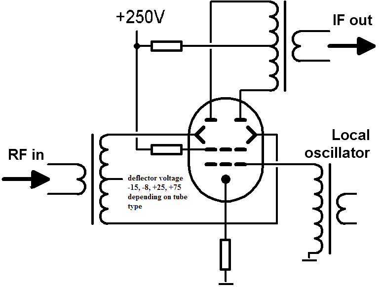 Mélangeur pour changement de fréquenceDans le meilleur des cas le changement de fréquence s'effectue par la multiplication de deux signaux: le signal d'antenne et le signal d'un oscillateur local. On a utilisé chez nous la triode-heptode ECH81 et UCH81 (GO, PO et ondes courtes), mais pour les fréquence plus élevées on additionne simplement les deux signaux (une triode radiofréquence et une triode hétérodyne) et on se base sur les caractéristiques non-linéaires des triodes pour faire apparaitre la fréquence intermédiaire. Le rendement à la conversion n'est pas bon, mais c'est le seul système qui peut être utilisé (récepteurs radio à bande FM avec ECC81 ou ECC85). Plus d'informations sur cette page consacrée au changement de fréquence.Le cercuit de principe est montré à droite. Le signal de l'oscillateur local est envoyé à la grille 1 et on peut ici aussi réaliser un circuit accordé entre la cathode et la première grille (pas d'oscillateur local séparé nécessaire). Le signal d'antenne est envoyé aux grilles directrices. A cause de la sensibilité relativement faible des grilles directrices on peut faire précéder le mixage par un étage d'amplification radiofréquences. L'octode à faisceau laminaire a comme avantage principal que le courant anodique total est déterminé uniquement par la grille 1. Dans une heptode (normalement utilisée comme tube mélangeur) il y a une influence de la grille 3 vers la grille 1 et inversément. Une grille 3 plus négative réduit le flot d'électrons et influence ainsi la charge d'espace de la grille 1. Ce circuit a de très bonnes caractéristiques et notament une faible influence de l'oscillateur local vers le signal d'antenne: l'oscillateur produit un signal symmétrique sur les deux grilles directrices et ce signal ne retourne pas à l'entenne comme avec les heptodes changeuses de fréquence classiques. Dans le sens inverse (signal d'antenne influençant l'oscillateur) il n'y a pas d'effet de traction (autotune) où un émetteur puissant tire la fréquence de l'oscillateur local. L'octode à faisceaux laminaire a aussi un effet de limiteur sur le signal appliqué aux électrodes directrices. Le "coude" de la fonction de transfert est ici bien prononcé et symmétrique. Cela permet de réduire l'influence des parasites si le signal radio préamplifié est envoyé aux grilles directrices. Utiliser un tel tube dans un récepteur est un peu too much, mais on va plutot l'utiliser comme modulateur radio dans les émetteurs. Modulateur AM et BLLe modulateur et le démodulateur peuvent utiliser les mêmes composants, il s'agit chaque fois d'une multiplication de deux signaux. La multiplication est commutative, cela veut dire qu'on peut appliquer le signal de l'oscillateur aux grilles directrices ou à la grille 1, mais en pratique l'une méthode est plus efficace que l'autre (voilà! Finalement vos cours de mathématiques vous auront servi a quelque chose).On envoie la porteuse d'une amplitude de 2.5Vpp sur la première grille et le signal audio à moduler sur les grilles directrices. Il faut ici un signal d'amplitude maximale de 200Vpp et on doit utiliser un transformateur élévateur de tension (un transfo de ligne de sonorisation 100V peut être utilisé). Il y a un potentiomètre de balance qui permet d'éliminer la porteuse. Comme la porteuse est présente avec une amplitude identique sur les deux anodes elle est éliminée par le transfo. La bande latérale indésirable doit encore être filtrée et le signal amplifié linéairement pour pouvoir être envoyé à l'antenne.