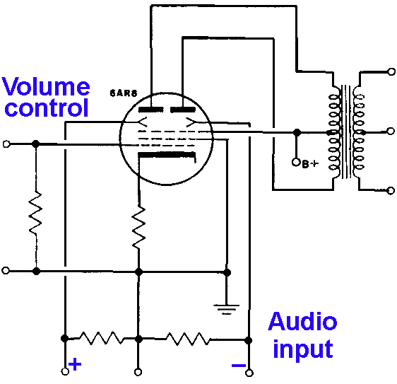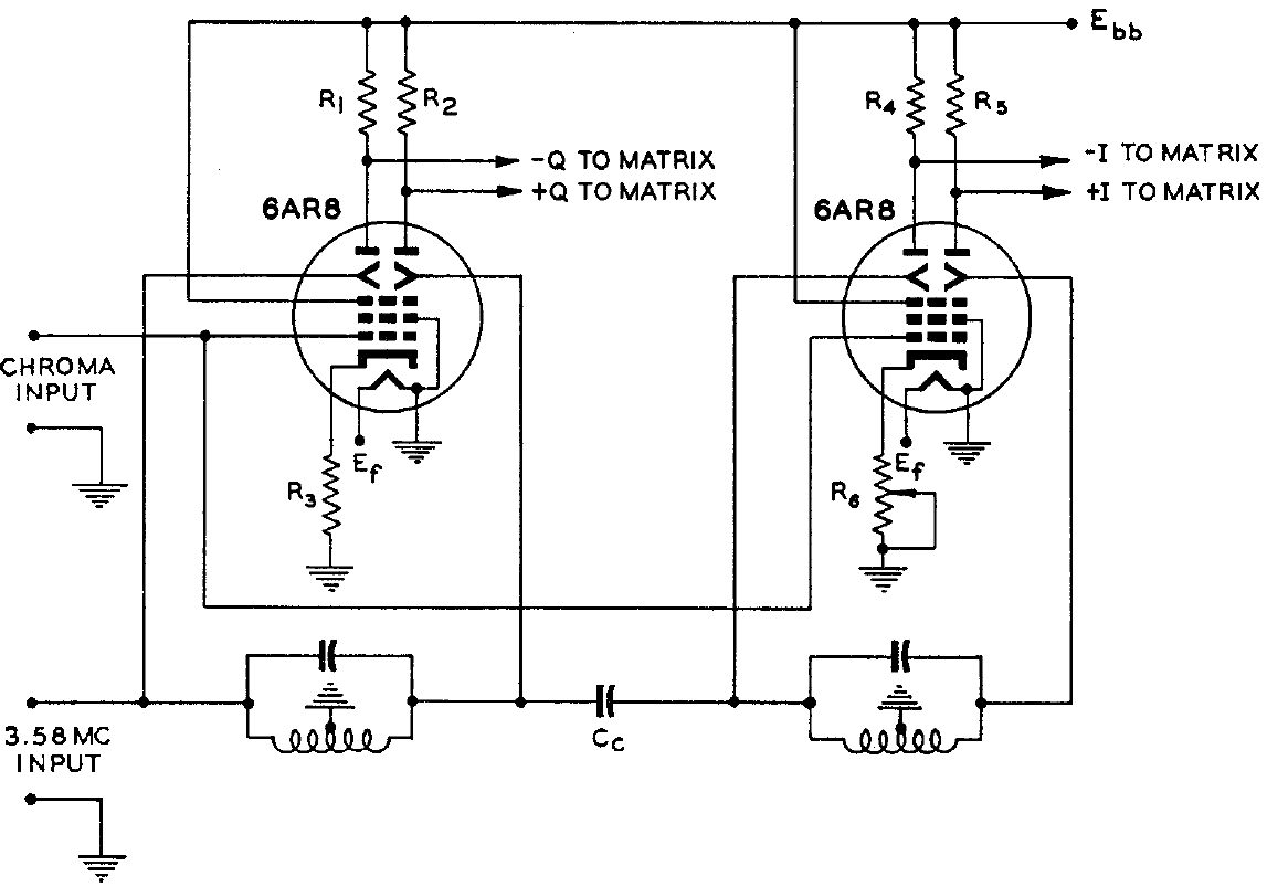 Le courant anodique dépend de la tension sur la grille de commande: L'influence de cette grille est importante et comparable à celle d'une grille de commande de pentode (pente de 6mA/V si on compte le flot total d'électrons). Si on relie les deux anodes, on a un fonctionnement en pentode classique. Les grilles directrices dévient le flot d'électrons vers l'une ou l'autre grille. Il faut une tension de deux fois 20V (par rapport à la masse) pour obtenir la déviation linéaire maximale, ce qui correspond à une pente de 0.75mA/V. Nous avons indiqué le courant de chaque anode pour une tension de grille 1 de -1V et pour une tension de grille directrice de -20 à +20V. Pour les grilles directrices, c'est la partie linéaire (verte) de la courbe. Le flot d'électrons est uniquement déterminé par la première grille, et le courant que ne va pas vers une anode va vers l'autre (le courant total reste le même). C'est moins le cas avec les grilles directrices traversées (type 1). La dissipation maximale de chaque anode est de 2W, le courant cathodique maximal est de 30mA et la tension d'alimentation est de 300V, mais l'octode est normalement utilisée avec un courant anodique de 1mA. Contrairement aux lampes classiques, ce tube est fortement influencé par le champ magnétique et la lampe doit être placée loin des transformateurs. Le champ magnétique dévie en effet le faisceau d'électrons. Démodulatrice synchrone des signaux NTSCL'octode a été conçue comme démodulatrice synchrone des signaux couleurs de la télévision (système NTSC). Le signal couleur est modulé en amplitude, mais contient simultanément les deux différentiels de couleur, déphasés à 90°. La norme NTSC est décrite plus en détail ici. On aurait pu utiliser le même type de démodulateur synchrone pour les téléviseurs européens (norme PAL), mais le tube n'a jamais été utilisé en Europe (nous avons toujours utilisé des démodulateurs à diodes).Voici le démodulateur synchone américain qui est très simple et fonctionnel. Nous avons le signal de l'oscillateur local (3.58MHz) pour la démodulation synchrone. Le signal est envoyé aux grilles directrices. Le condensateur Cc produit un déphasage de 90° pour détecter la seconde composante couleur. Le système américain original n'utilise pas de différences de couleurs (B-Y et R-Y) comme chez nous, mais des signaux Q et I à partir desquels on peut reconstruire les différences de couleurs via une matrice. C'est la raison d'avoir des signaux négatifs -I et -Q en plus des signaux positifs +I et +Q et c'est ici qu'on remarque l'avantage de l'octode par rapport à un démodulateur synchrone à diodes. Réglage du volume et limiteur/compresseurVoici un réglage du volume électronique. La tension (négative) sur la grille de commande détermine le courant qui traverse le tube et donc le facteur d'amplification. Ce réglage du volume permet un réglage de 10.000:1 (80dB), donc amplement suffisant pour un réglage du volume. Une autre utilisation possible est une table de mixage commandée à distance. Les signaux audio ne doivent pas être transportés à distance, uniquement une tension continue pour le volume.Pour ne pas avoir de diminution de l'amplitude, il faut que l'impédance que voit chaque anode soit supérieure à 1.5kΩ. On pourrait en fait réaliser un petit amplificateur push pull fonctionnant en classe A avec ce montage (puissance d'environ 3.5W), mais cela n'a jamais été le but de cette octode. Ce montage n'a pas été utilisé comme réglage du volume à distance, mais bien comme compresseur de dynamique. La linéarité est excellente tant que le tube fonctionne symmétriquement: la tension de réglage sur la grille 1 détermine le courant total vers des deux anodes et donc la pente (différence de courant des deux anodes par rapport à la différence de tension sur les deux grilles directrices). La linéarité est bien meilleure qu'avec les tubes normalement utilisés comme compresseurs de dynamique (EF83: tube audio à pente variable) qui ne peuvent être utilisés que pour des signaux microphoniques.