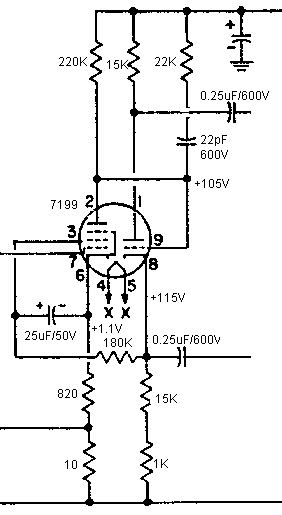 | La triode-pentode 7199 a été conçue spécifiquement comme étage préamplificateur et déphaseur cathodyne pour les amplificateurs, mais ce tube est devenu très rare, c'est pour cela que je vous montre les alternatives. |