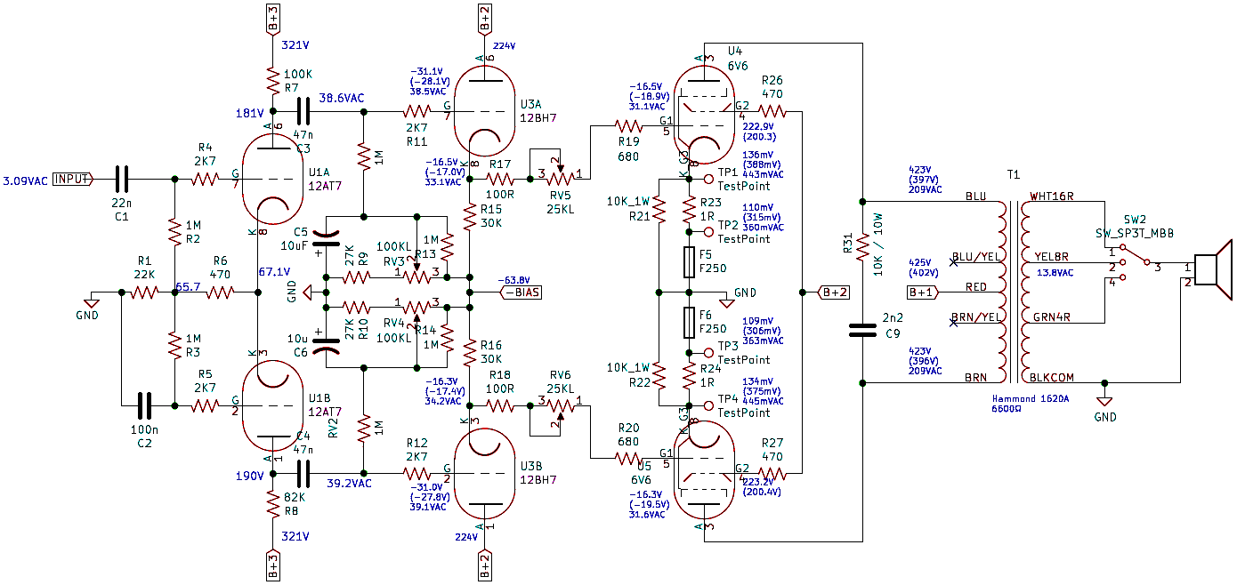 ![]() Modulateur pour émetteur AMLa commande en classe B était souvent utilisée pour les modulateurs de radio AM (radiodiffusion en AM). Un signal puissant est nécessaire, mais une distorsion de 5% est acceptable. L'étage déphaseur est réalisé sous forme d'un transfo. La modulation est limitée par un compresseur et l'étage audio travaille presque continuellement à puissance maximale. Pour augmenter le rendement on fait travailler l'étage de puissance audio en classe B2.Le signal audio est superposé au courant anodique d'un des tubes radio-fréquences (généralement l'avant dernier de la partie RF). La puissance audio doit être de 40%. Le montage à droite montre le principe du modulateur (sans le couplage à l'étage radio-fréquences). Le signal à l'entrée fait 400Vtt. La triode double ne procure pas d'amplification, mais commande le push pull équipé de 6L6 (un tube bien connu des radio-amateurs sous sa version 807 avec têton anodique). Plusieures tensions d'alimentation sont nécessaires: +270V pour le préampli et tension de g2, -67.5V pour la tension négative et +360V pour la tension anodique des tubes de puissance. Amplificateur avec 6V6Un exemple d'amplificateur récent qui permet de démontrer l'influence du passage de la classe AB1 à la classe AB2. Cet amplificateur utilise deux 6V6 qui peuvent normalement fournir une puissance d'environ 14W. Avec une commande en classe AB2 on arrive à 23.8W. Les tensions alternatives indiquées sur le schéma sont des tensions RMS.L'étage d'entrée est un déphaseur de Schmidt (avec résistance cathodique commune non découplée). La valeur de la résistance étant élevée, on a un facteur d'amplification relativement faible (il faut une tension de 3.1V à l'entrée pour atteindre la puissance nominale), mais par contre l'égalité des deux tensions en sortie est assez bonne. Cet étage utilise une double triode 12AT7 qui combine un facteur d'amplification élevé avec une bonne linéarité. L'étage d'attaque est une double triode 12BH7, un tube qui n'a pas d'équivalent européen. C'est un tube qui permet un courant cathodique relativement élevé et qui peut donc très bien attaquer le tube de puissance en classe AB2. La polarisation de chaque tétrode de puissance s'effectue via cet étage (ajustables RV3 et RV4).