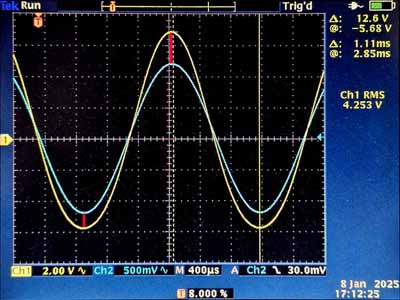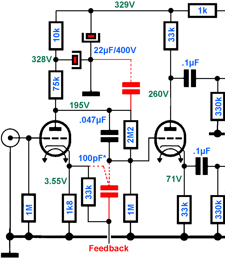 La distorsion est acceptable car le circuit est destiné à un ampli push pull de faible ou moyenne puissance qui a besoin d'une tension d'attaque de 15Vrms, et là la distorsion n'est plus visible. Le préampli et le déphaseur sont repris dans la boucle de contre réaction, ce qui réduit les distorsions. Circuit finaliséEt le circuit pour installation dans un ampli. la réduction de la valeur des résistances de la seconde triode réduit légèrement le gain général.Nous remarquons la tension anodique élevée de la première triode, ce qui est nécessaire pour avoir un fonctionnement linéaire d'une ECC83 (autrement on a l'effet montré par l'image d'oscilloscope). C'est pour cela qu'un couplage direct avec le déphaseur n'est pas possible. Faire travailler un ECC83 avec une tension anodique de 70V pour avoir un couplage direct n'est pas une bonne solution, et surtout pas ici car la triode ECC82 a une tension de polarisation de -10V. Le cathodyne est polarisé pour avoir le sweep le plus élevé possible sans que les distorsions n'apparaissent (environ 15V eff). Les résistances ont une faible valeur pour permettre la commande de lampes d'une puissance relativement élevée. En rouge les petits condensateurs pour stabiliser l'ampli quand on utilise la contre réaction. C'est un circuit qui peut être intégré dans tous les amplis et toutes les possibilités ont été indiquées. En pratique on n'utilise qu'un seul condensateur: soit de l'anode du préampli vers la masse, soit en parallèle sur la résistance de 33kΩ, soit entre la ligne de feedback et la grille du cathodyne. La valeur du condensateur dépend de sa position, mais aussi du transfo de sortie utilisé (le condensateur compense le déphasage du transfo aux fréquences élevées). La sensibilité est de 320mW pour arriver à un signal en sortie de 15V pour attaquer un EL84 ou un EL508. Si nous utilisons une contre réaction limitée (10dB donc une réduction du signal de 3×) nous avons besoin d'un signal à l'entrée de 1Veff pour obtenir la puissance nominale de l'ampli. L'amplification si on utilise une triode est relativement faible (47×) et on peut éventuellement utiliser une triode-pentode comme le ECF80 PCF80 qui a un gain de 130×. |